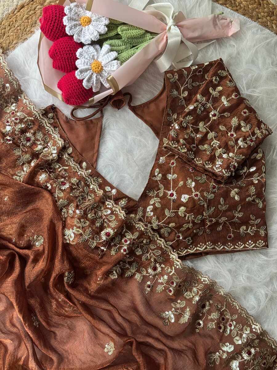 DESIGNER FENDY CHIFFON EMBROIDERY SEQUENCE AND THREAD WORK AND SCALLOP BORDER WORK SAREE WITH STITCHED BLOUSE CHIKU