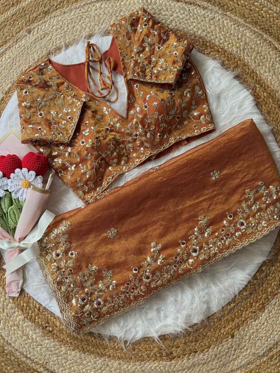 DESIGNER FENDY CHIFFON EMBROIDERY SEQUENCE AND THREAD WORK AND SCALLOP BORDER WORK SAREE WITH STITCHED BLOUSE MUSTARD