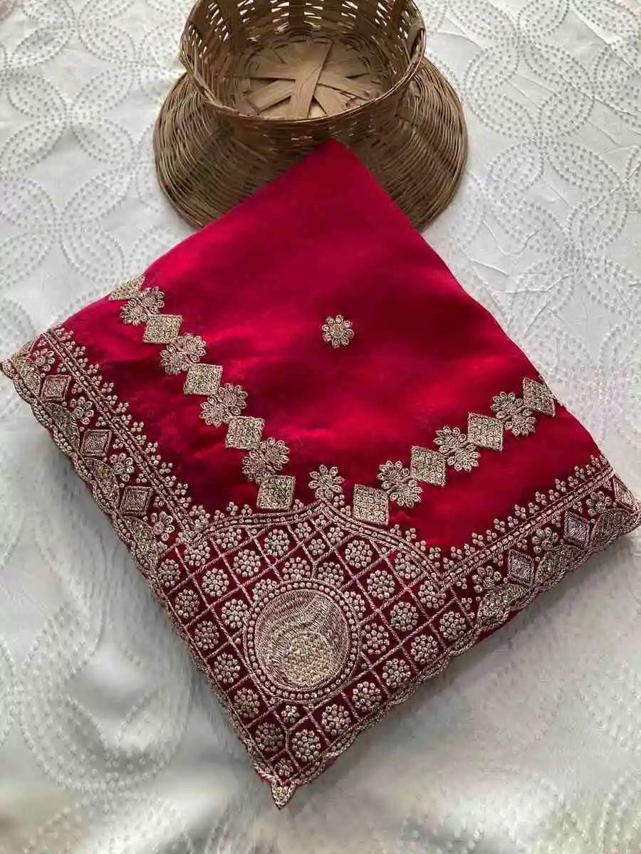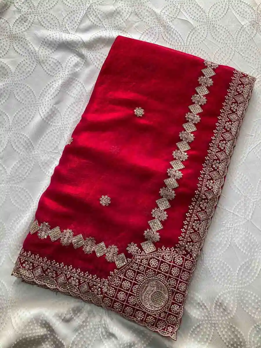 SAREE FABRIC : PURE SOFT JIMMY CHOO WITH HEAVY EMBROIDERY MULTI TREADS , CODING & SEQUENCE WORK & FANCY CUT WORK BORDER