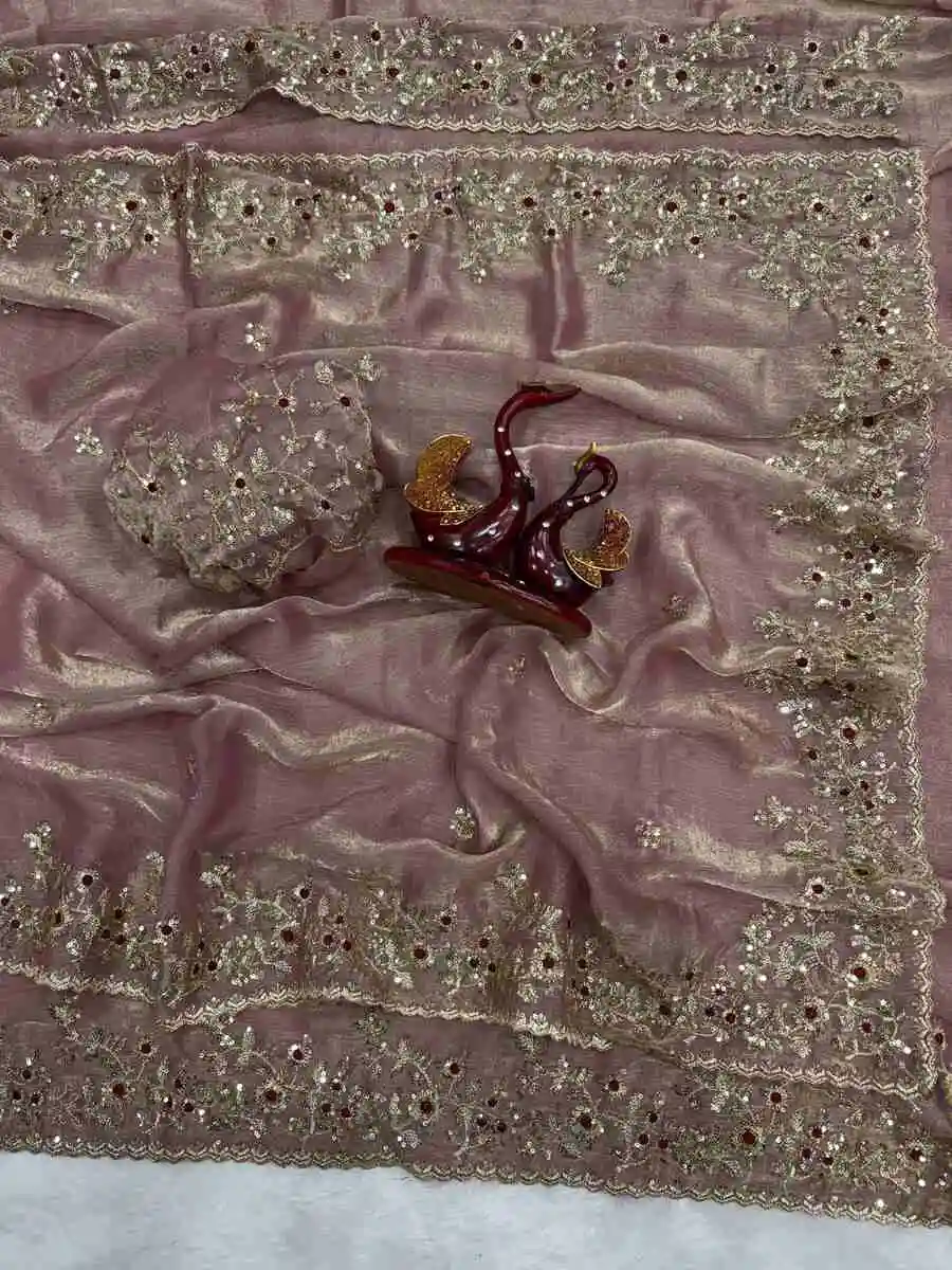 SAREE FABRIC : PURE SOFT JIMMY CHOO WITH HEAVY EMBROIDERY MULTI TREADS , CODING & SEQUENCE WORK & FANCY CUT WORK BORDER