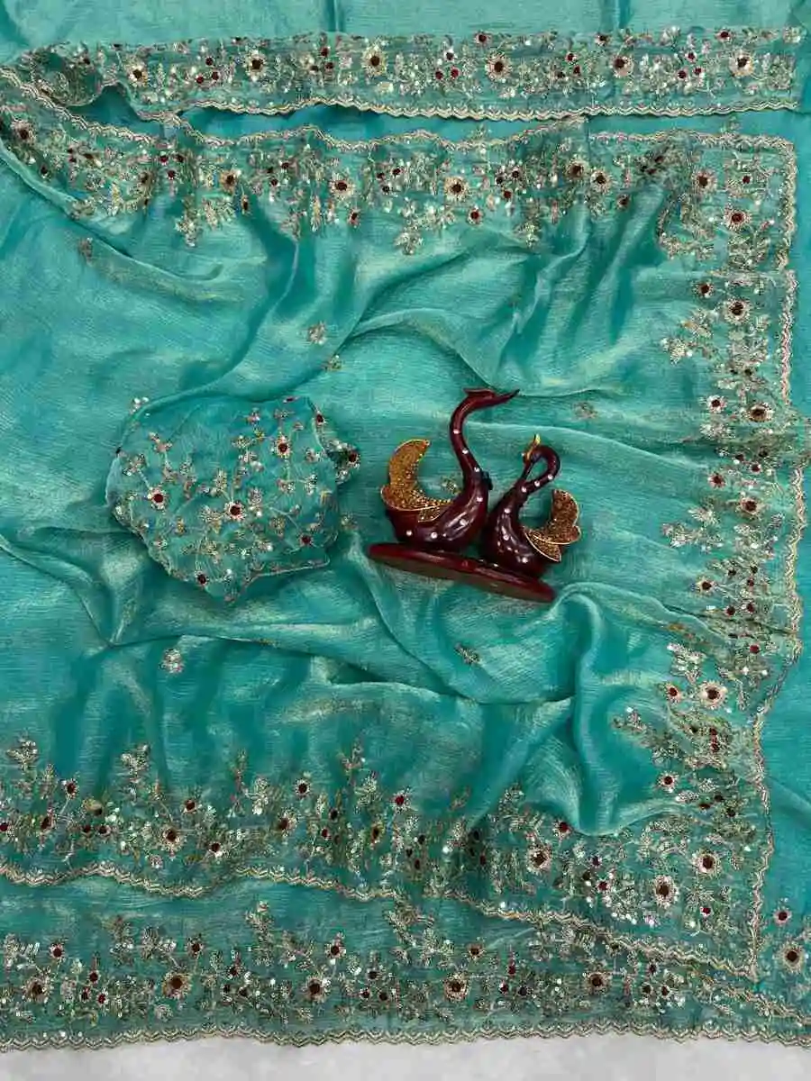 SAREE FABRIC : PREMIUM DIAMOND CHINON SILK WITH HEAVY EMBROIDERY CODING MULTI TREADS AND SEQUENCE WORK
