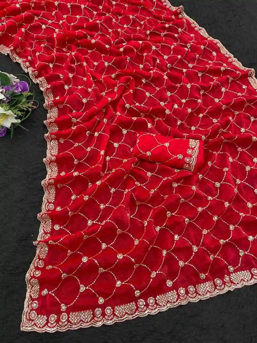 DESIGNER FENDY CHIFFON SILK SEQUENCE EMBROIDERY WORK WITH CUT WORK BORDER WORK SAREE WITH UNSTITCHED BLOUSE RED