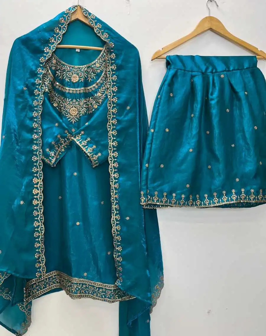 SHARARA FABRIC : PURE HEAVY CHINON SILK WITH EMBROIDERY SEQUENCE WORK WITH REAL MIRROR HAND WORK