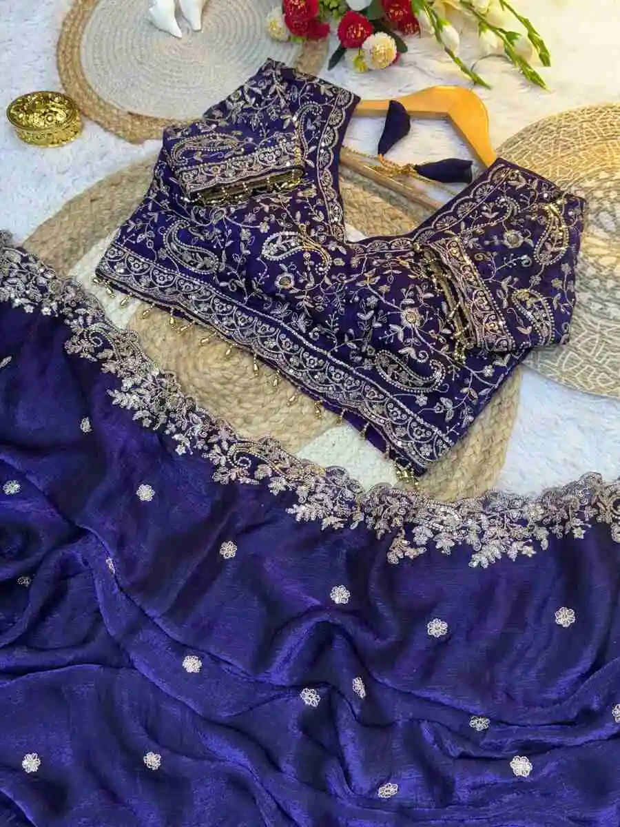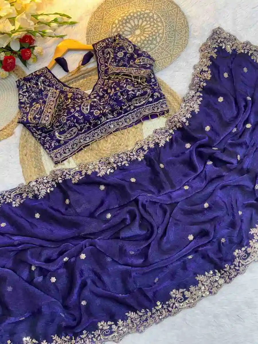 DESIGNER FENDY SATIN EMBROIDERY SEQUENCE WITH BORDER AND BUTTI WORK SAREE WITH STITCHED BLOUSE PURPLE