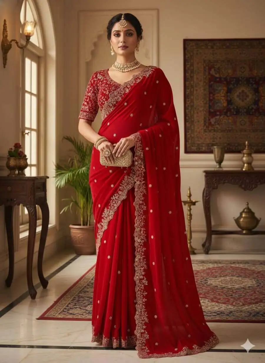 DESIGNER FENDY SATIN EMBROIDERY SEQUENCE WITH BORDER AND BUTTI WORK SAREE WITH STITCHED BLOUSE RED