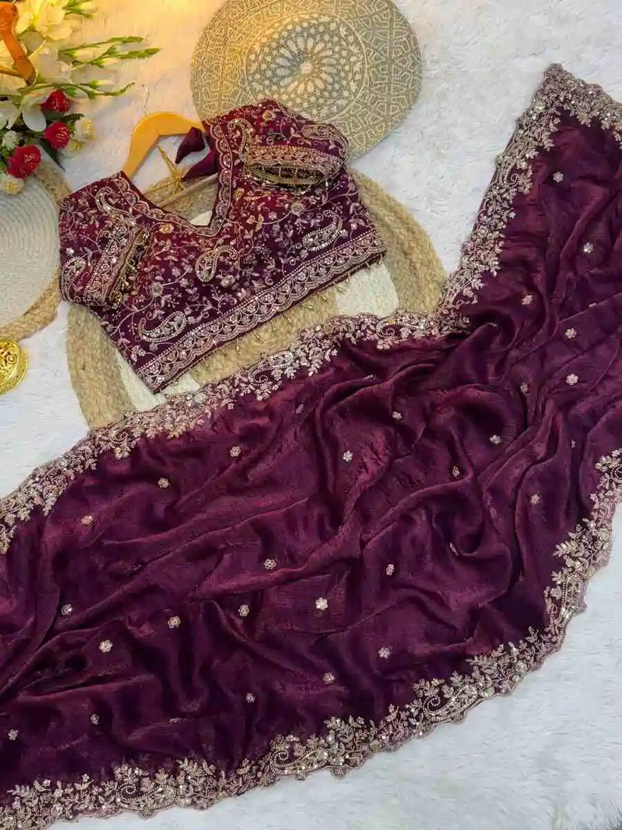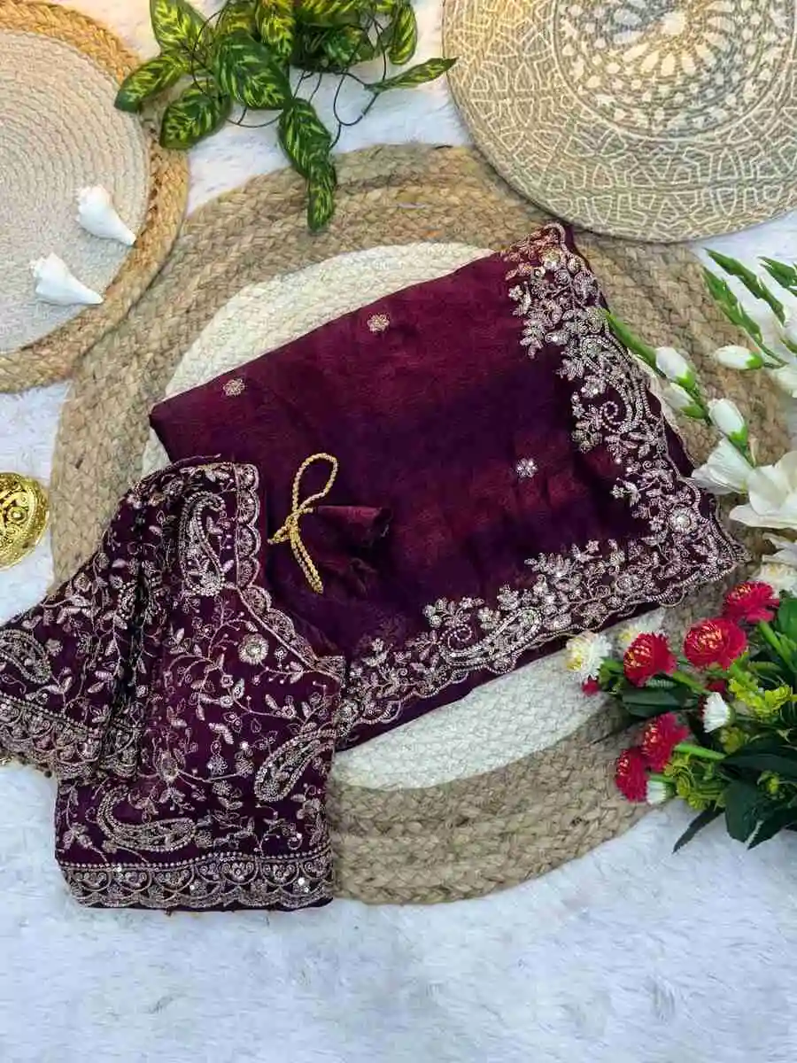 DESIGNER FENDY SATIN EMBROIDERY SEQUENCE WITH BORDER AND BUTTI WORK SAREE WITH STITCHED BLOUSE WINE