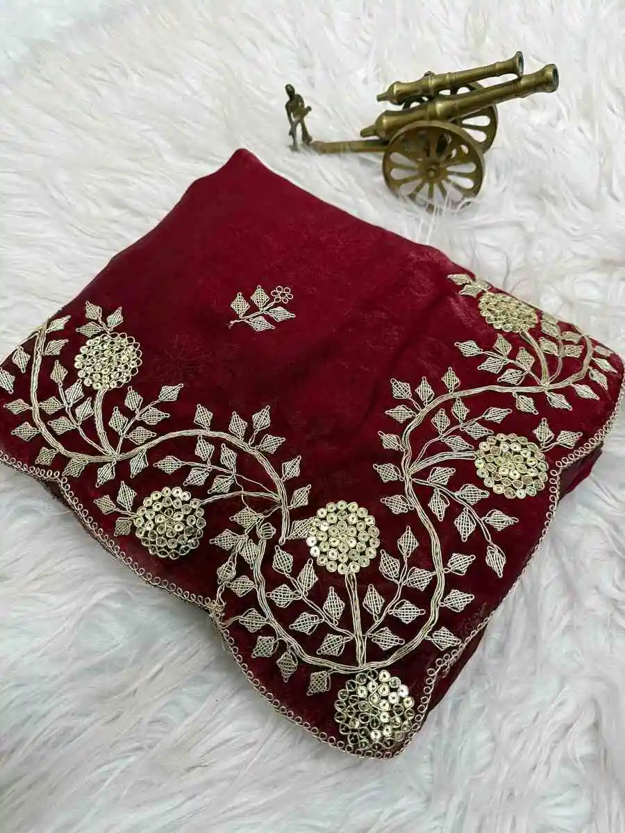 DESIGNER FENDY SATIN EMBROIDERY WORK AND MULTI THREAD WORK WITH ARC CUT WORK BORDER SAREE WITH UNSTITCHED BLOUSE MAROON