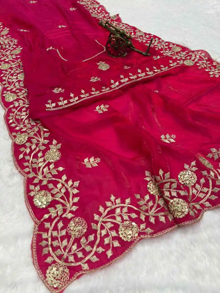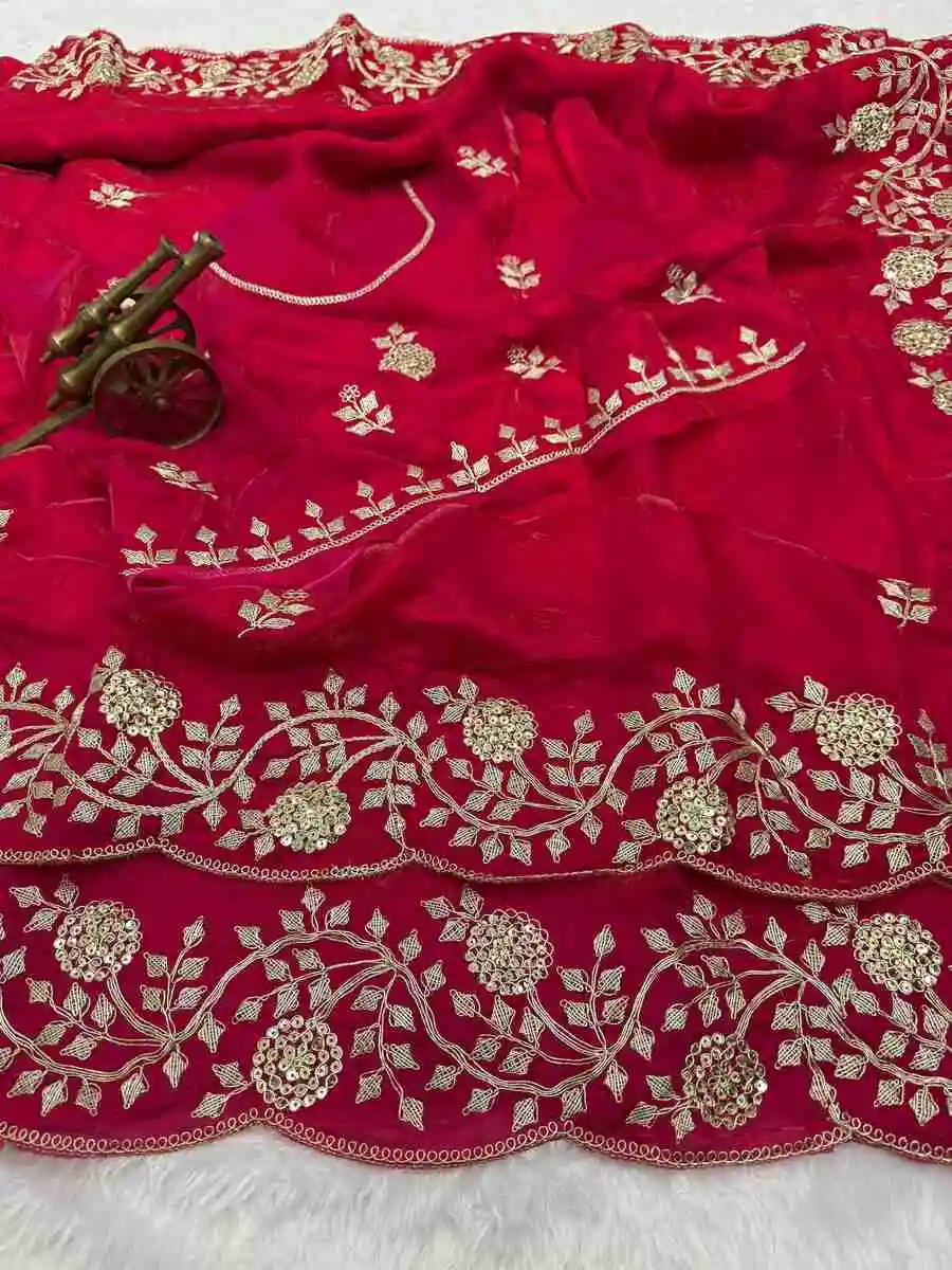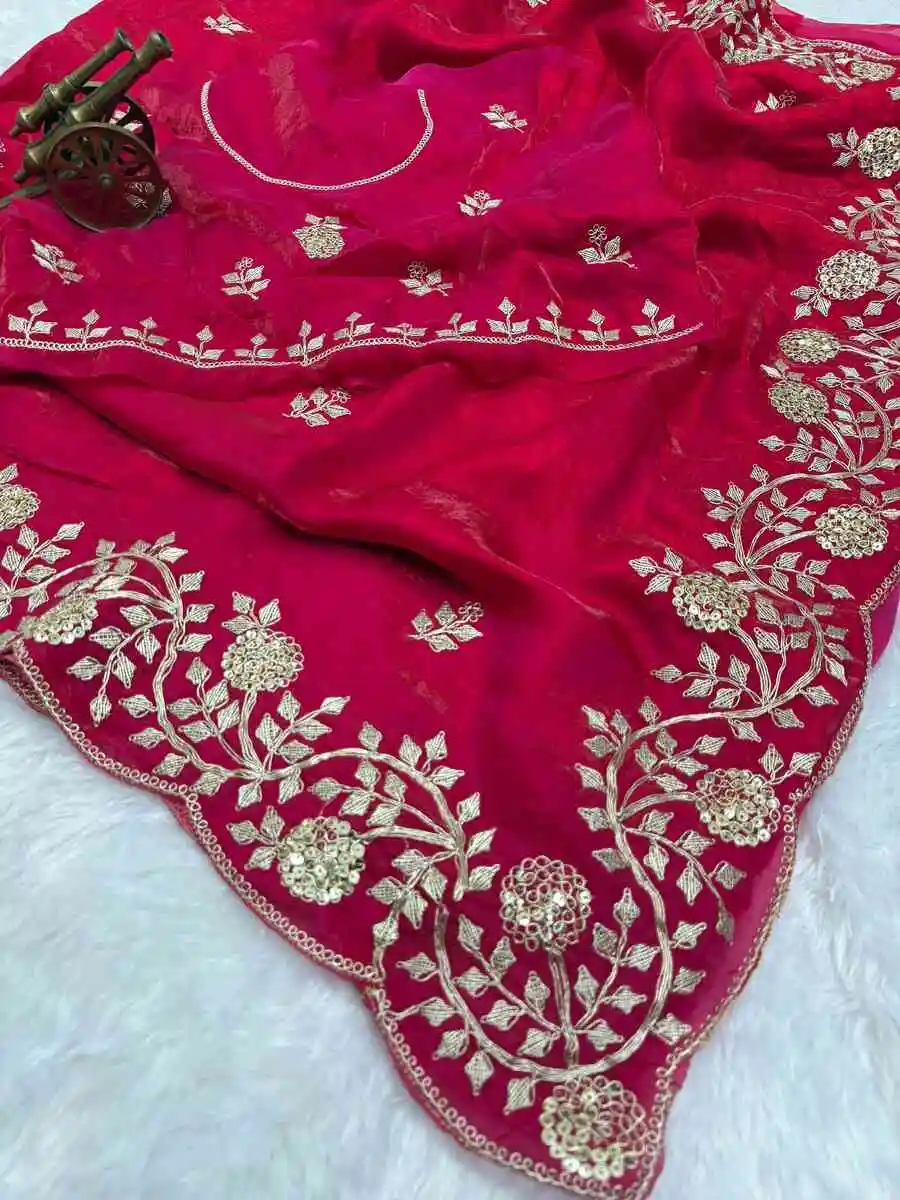 SAREE FABRIC : PURE SOFT JIMMY CHOO WITH HEAVY EMBROIDERY MULTI TREADS , CODING & SEQUENCE WORK & FANCY CUT WORK BORDER