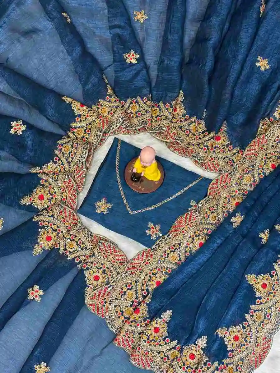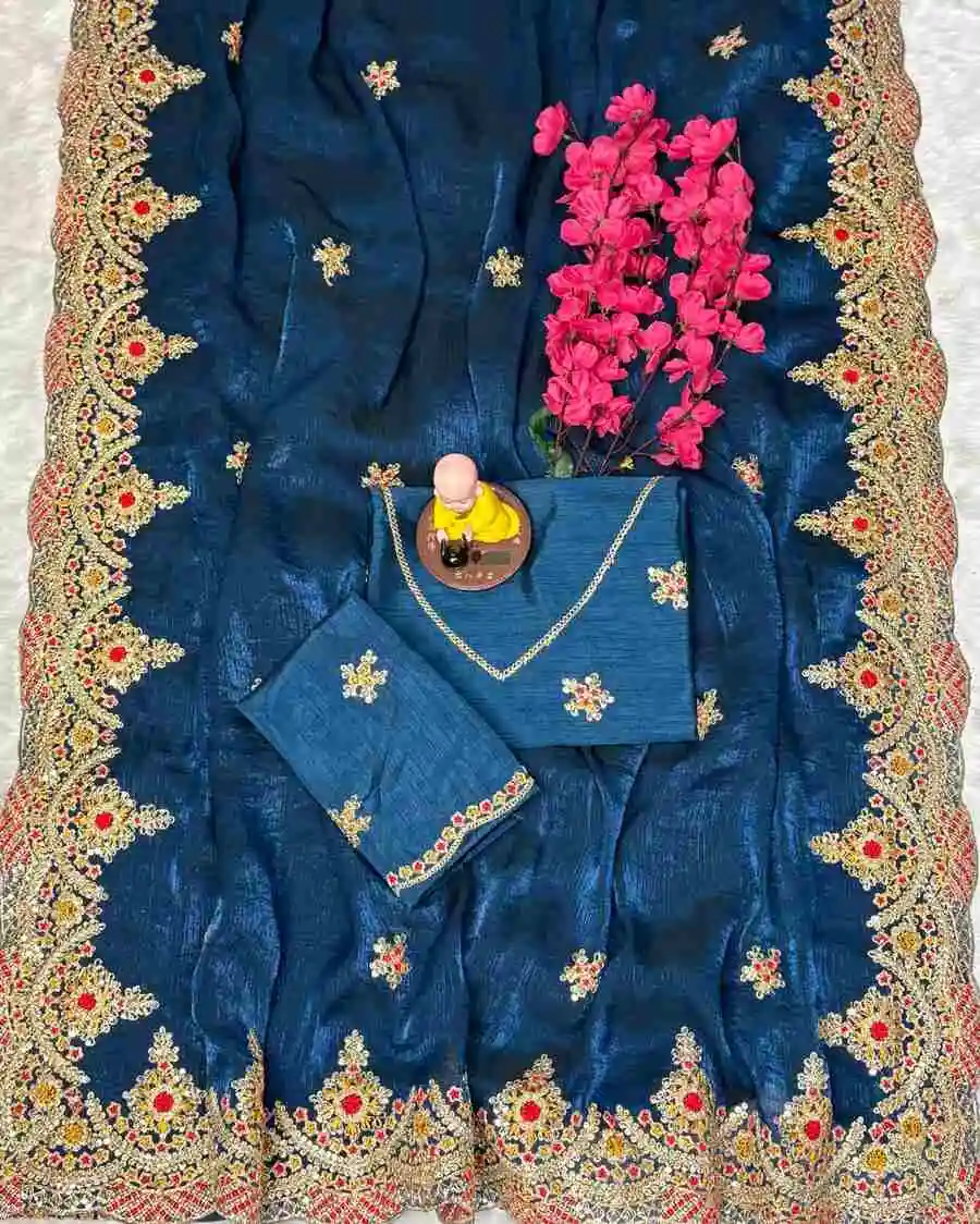 SAREE FABRIC : PREMIUM DIAMOND CHINON SILK WITH HEAVY EMBROIDERY CODING MULTI TREADS AND SEQUENCE WORK