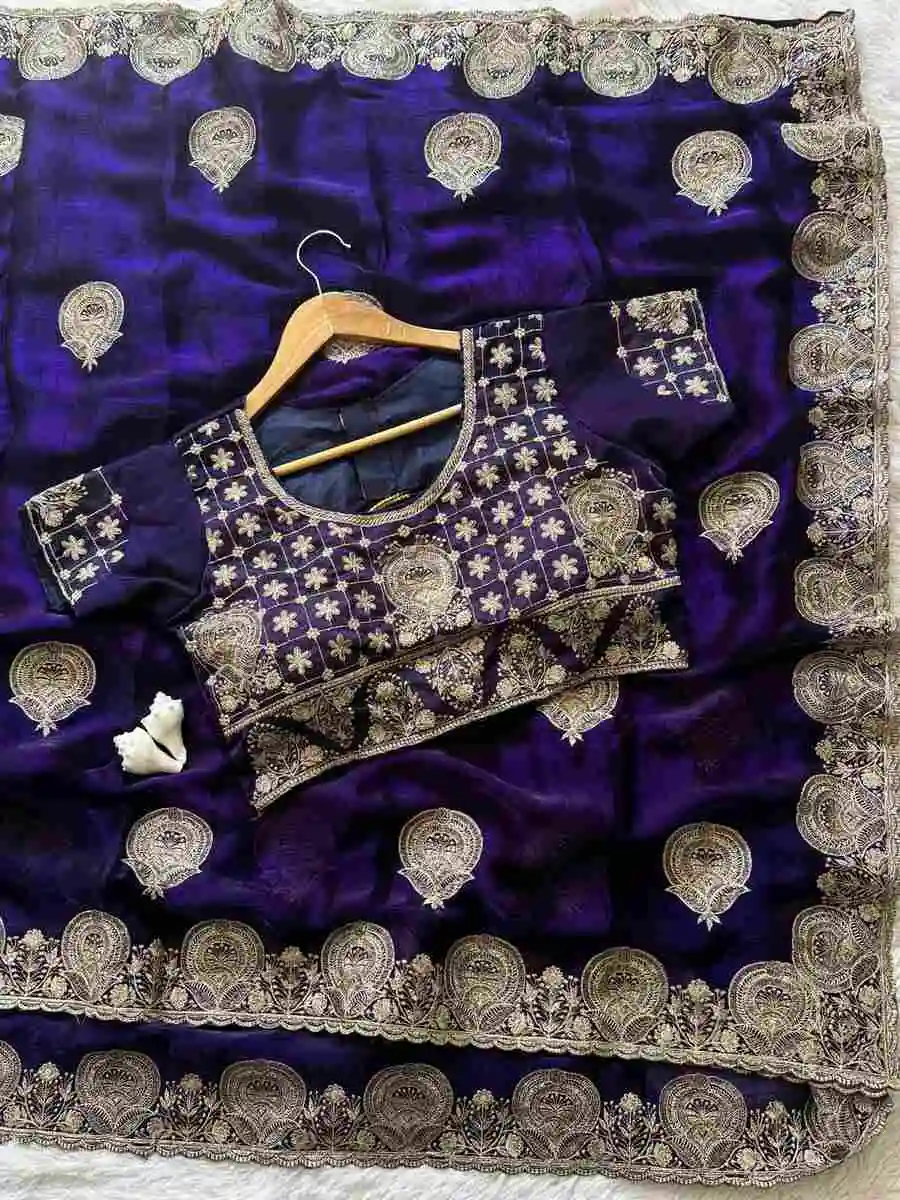 DESIGNER FENDY SATIN EMBROIDERY WORK HEAVY BORDER WITH BUTTA WORK SAREE WITH STITCHED BLOUSE PURPLE