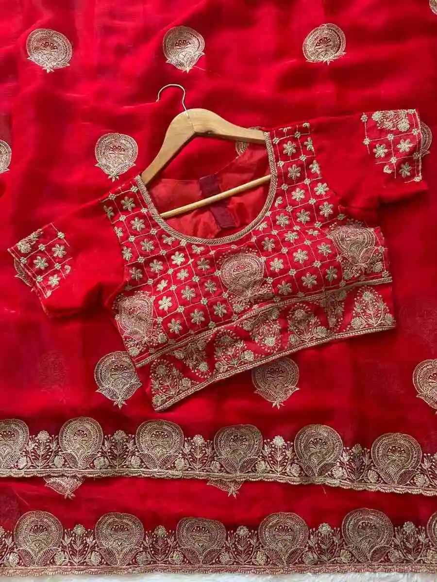 DESIGNER FENDY SATIN EMBROIDERY WORK HEAVY BORDER WITH BUTTA WORK SAREE WITH STITCHED BLOUSE RED