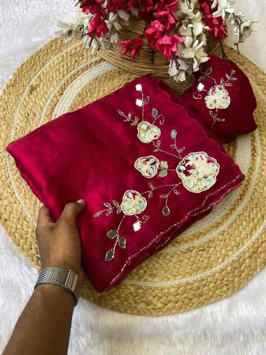 DESIGNER FENDY SATIN HAND WORK AND PATCH WORK BUTTA WORK SAREE WITH UNSTITCHED BLOUSE RANI