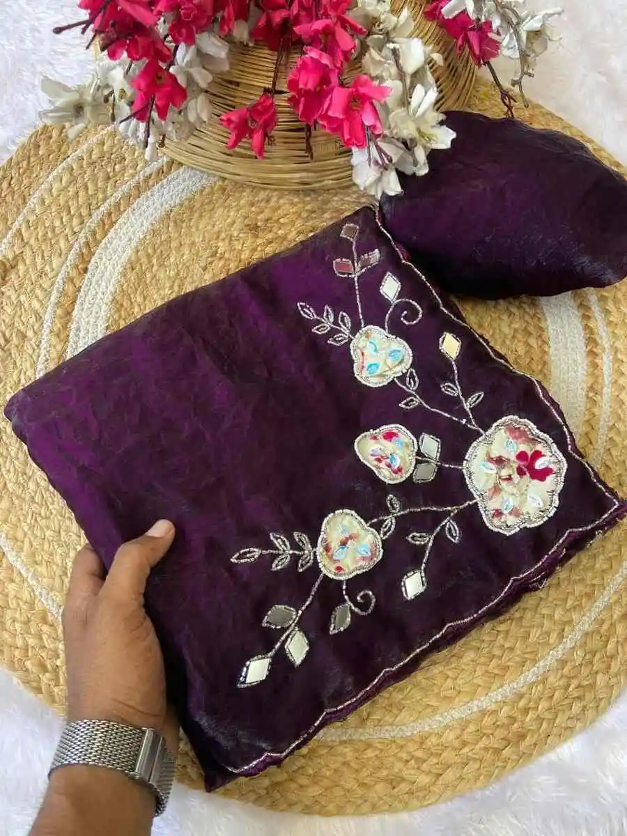 DESIGNER FENDY SATIN HAND WORK AND PATCH WORK BUTTA WORK SAREE WITH UNSTITCHED BLOUSE WINE