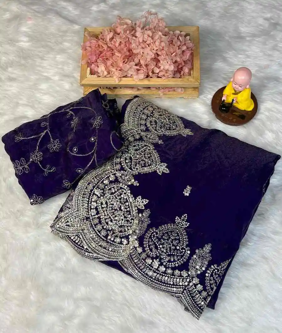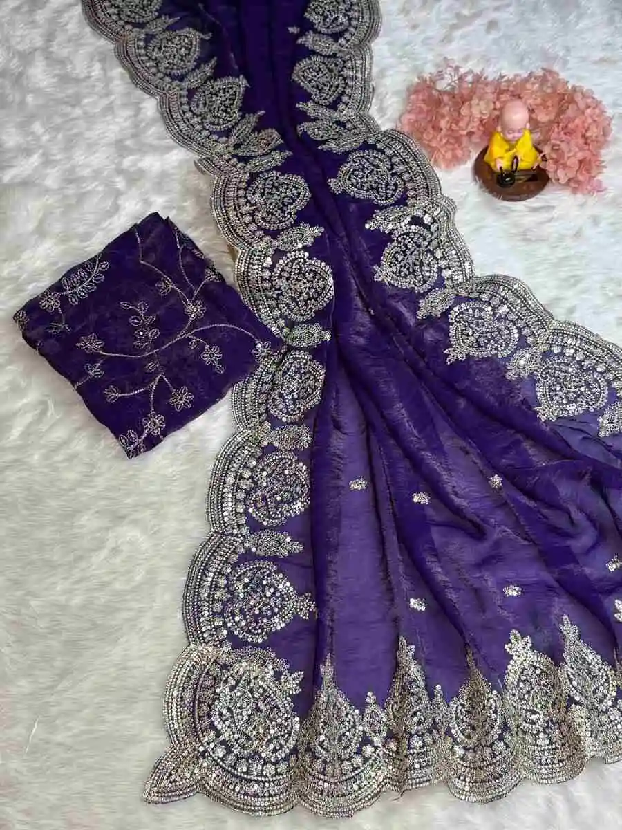 SAREE FABRIC : PREMIUM DIAMOND CHINON SILK WITH HEAVY EMBROIDERY CODING MULTI TREADS AND SEQUENCE WORK