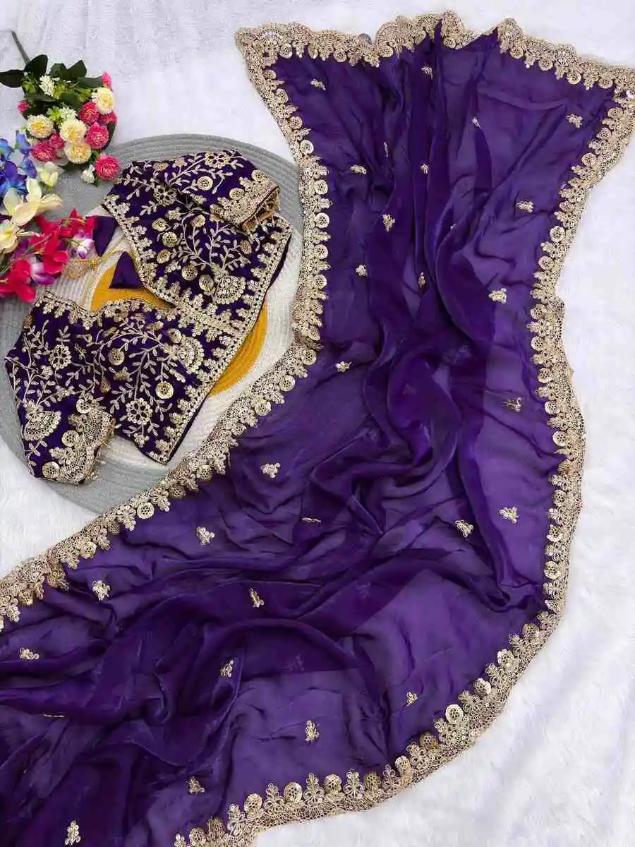 DESIGNER FENDY SATIN SILK EMBROIDERY SEQUENCE & CODING WITH CUT WORK BORDER SAREE WITH STITCHED BLOUSE PURPLE