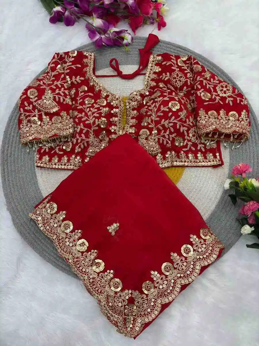 DESIGNER FENDY SATIN SILK EMBROIDERY SEQUENCE & CODING WITH CUT WORK BORDER SAREE WITH STITCHED BLOUSE RED