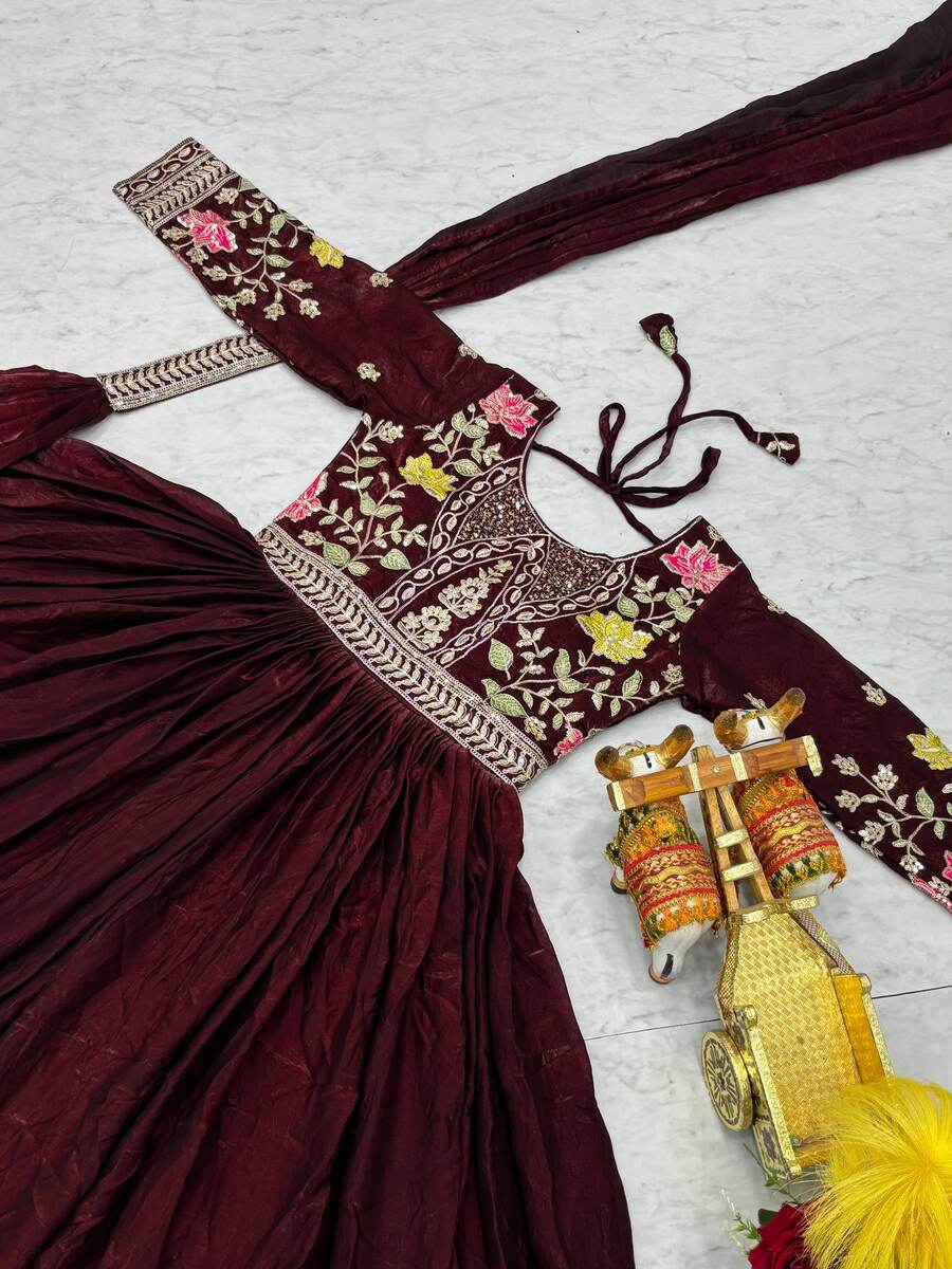 DESIGNER FENDY SILK CODING SEQUENCE & THREAD EMBROIDERY WORK GOWN WITH DUPATTA MAROON
