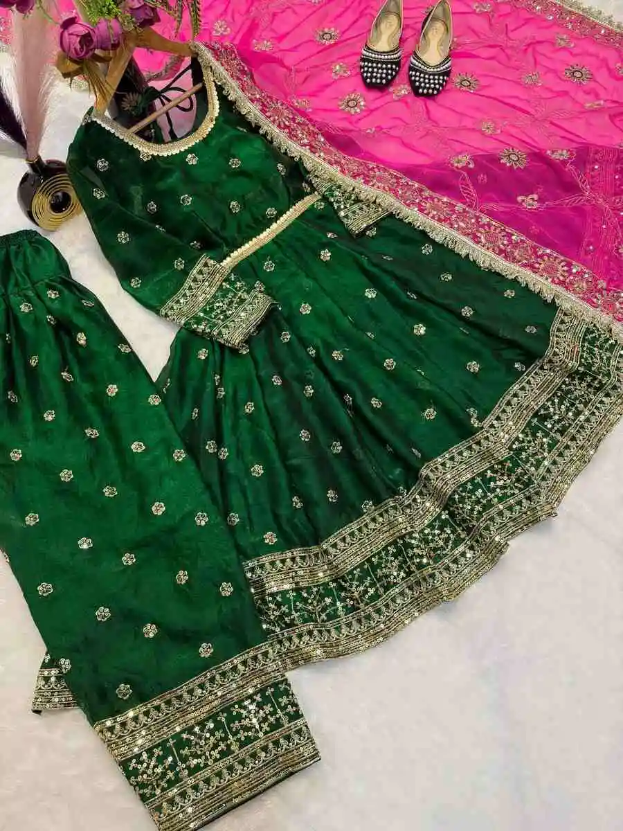 DESIGNER FENDY SILK EMBROIDERY 5 MM SEQUENCE WORK TOP PATIYALA WITH DUPATTA GREEN