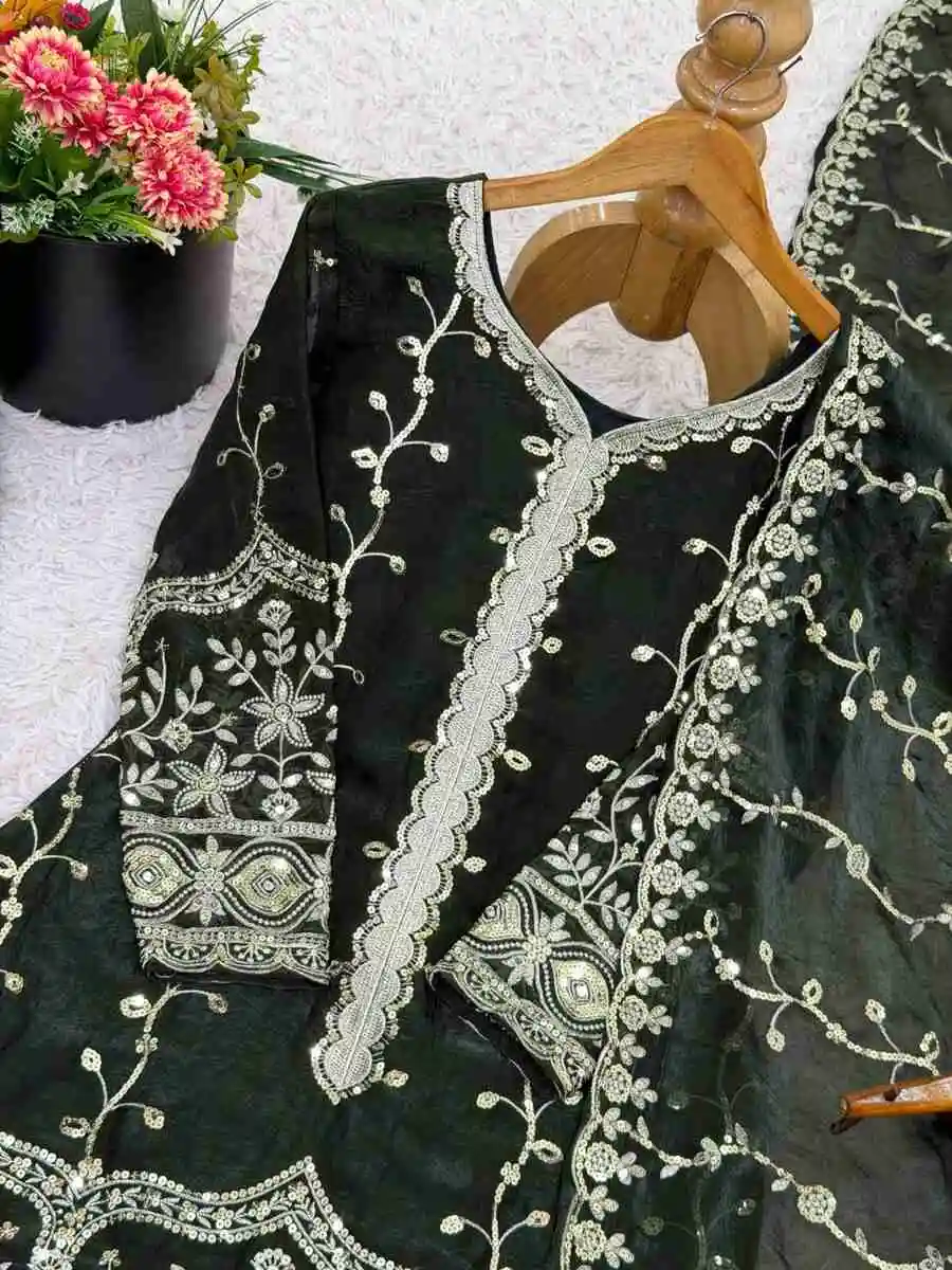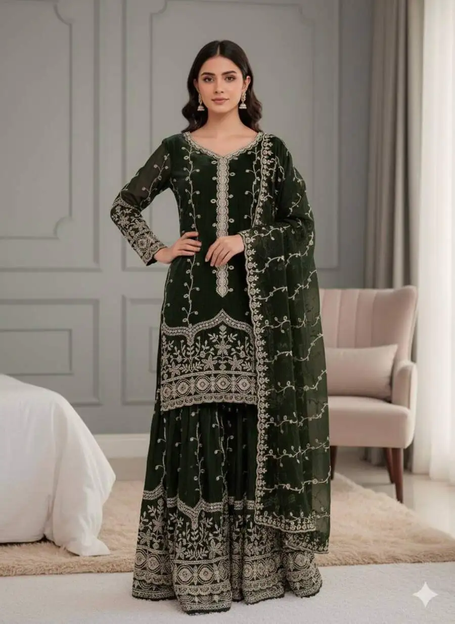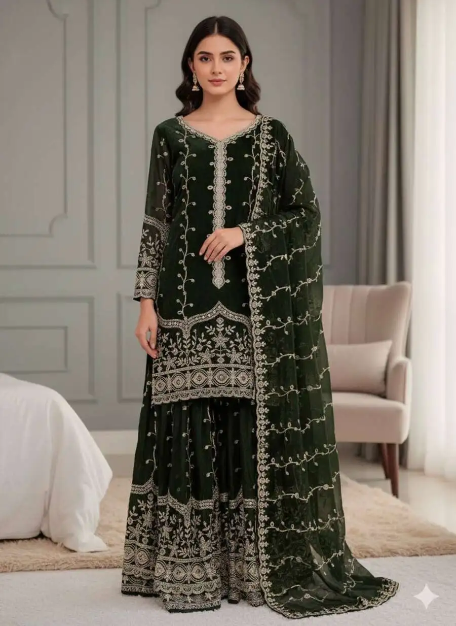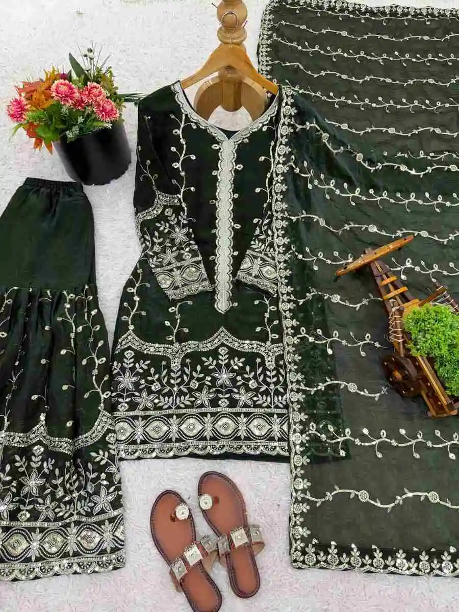 DESIGNER FENDY SILK EMBROIDERY SEQUENCE WORK TOP SHARARA WITH DUPATTA GREEN