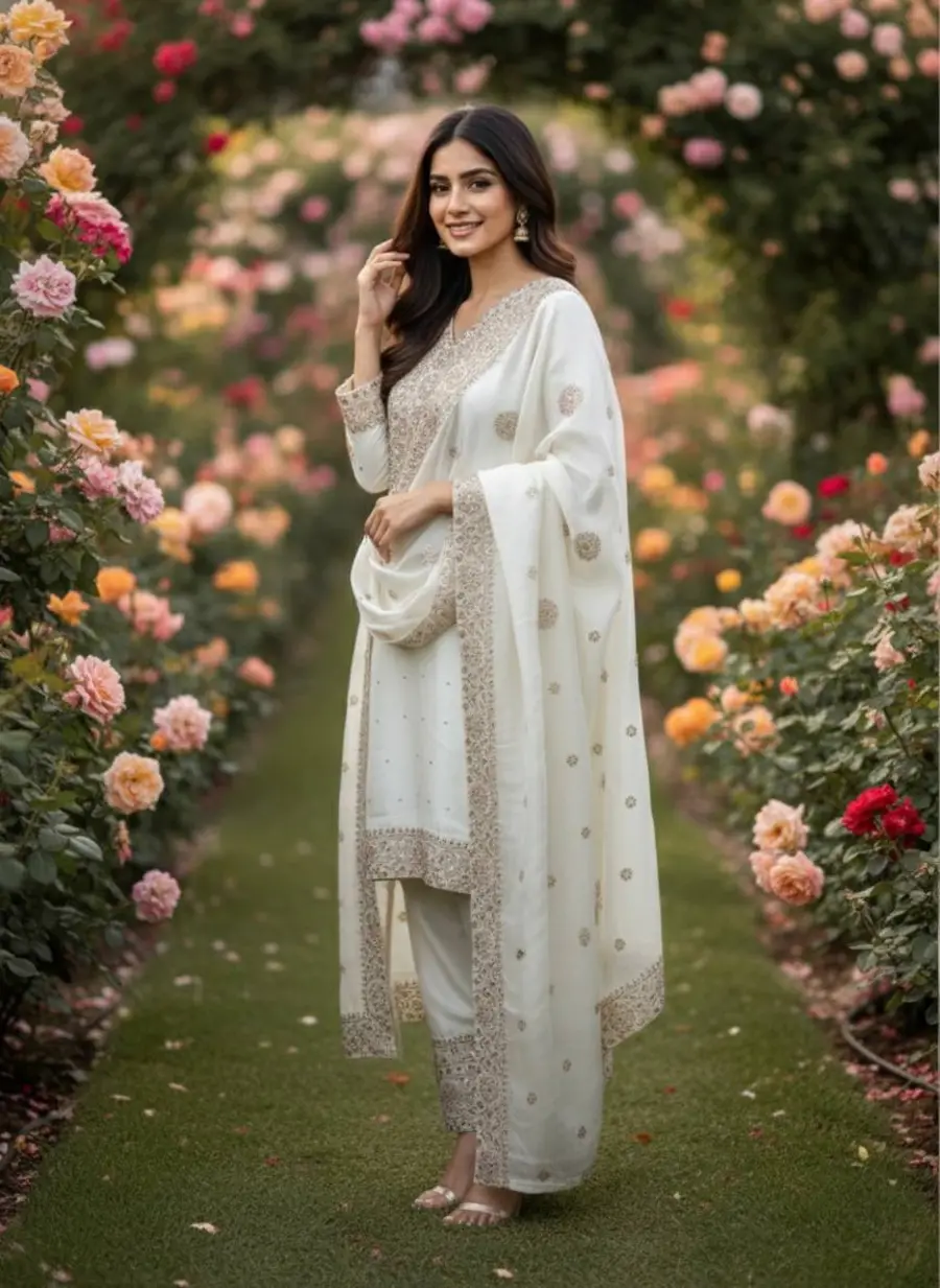 DESIGNER FENDY SILK EMBROIDERY SEQUENCE WORK WITH HAND DIAMOND WORK TOP PALAZZO WITH DUPATTA WHITE