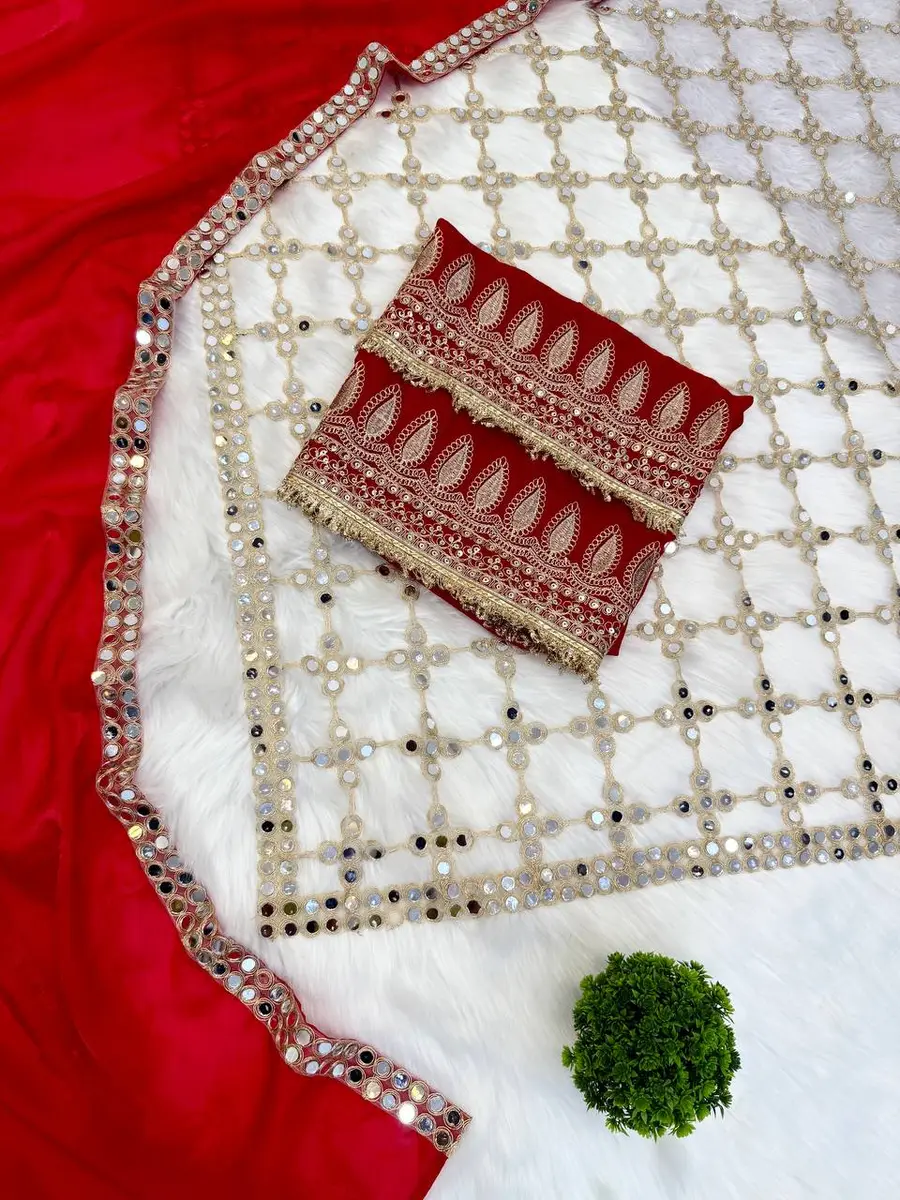 DESIGNER FENDY SILK REAL MIRROR WORK WITH LACE BORDER WORK SAREE WITH UNSTITCHED BLOUSE RED