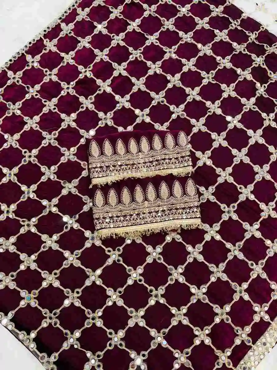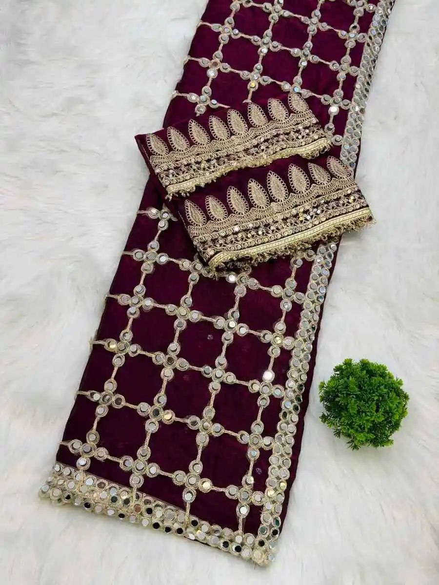DESIGNER FENDY SILK REAL MIRROR WORK WITH LACE BORDER WORK SAREE WITH UNSTITCHED BLOUSE WINE