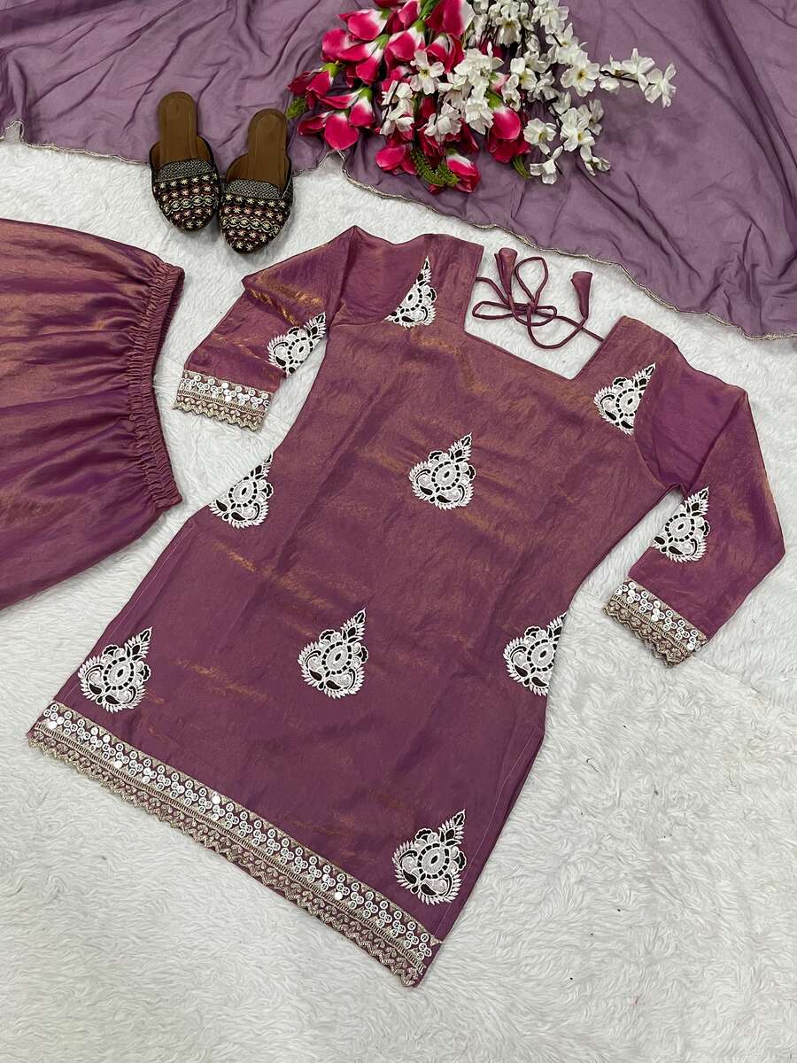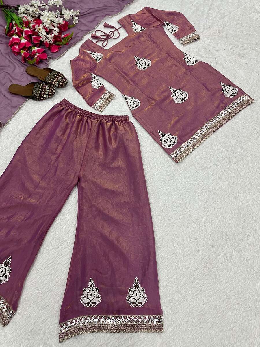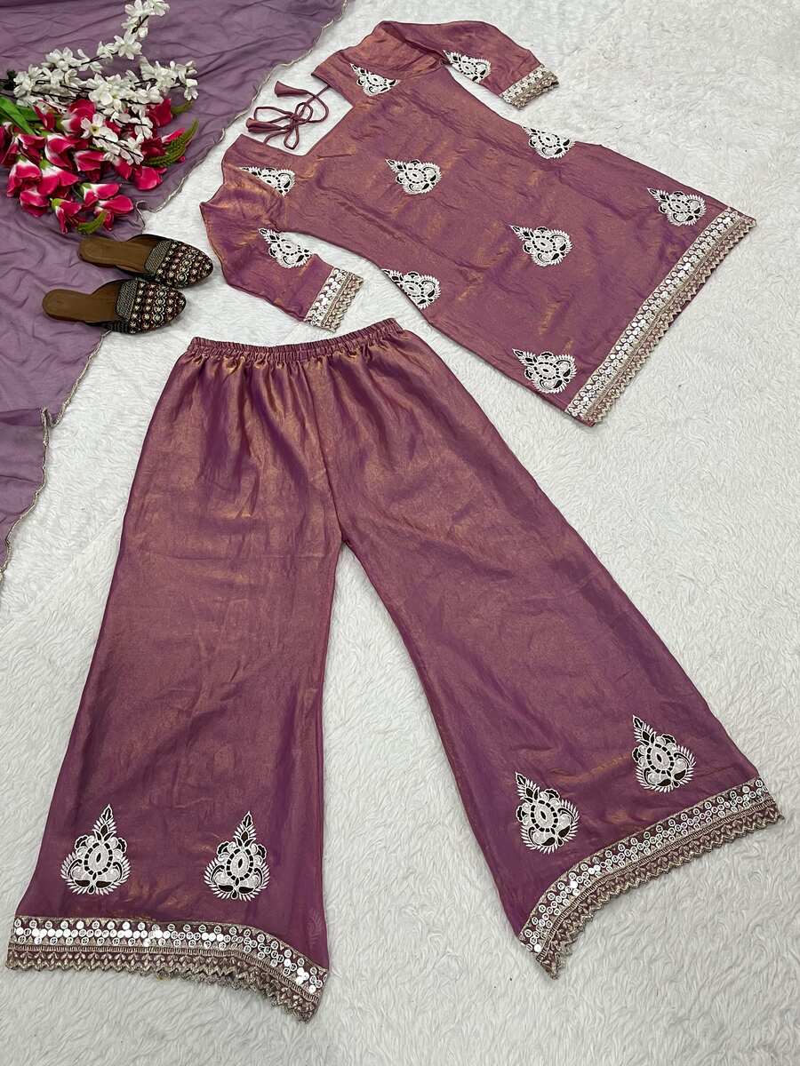 DESIGNER FENDY SILK SEQUENCE EMBROIDERY WORK TOP PALAZZO WITH DUPATTA LAVENDER