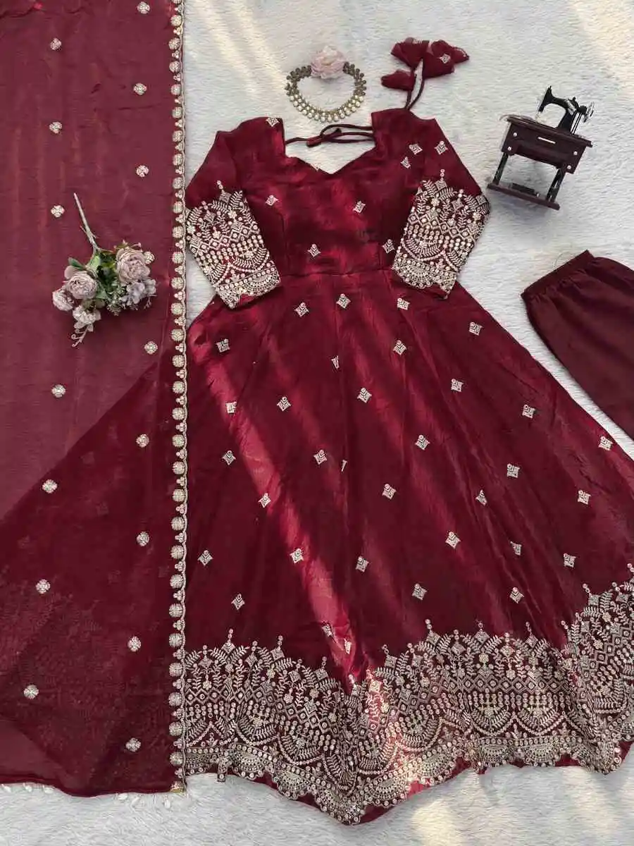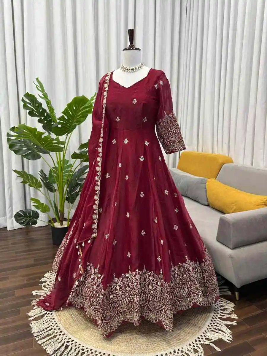 DESIGNER FENDY SILK THREAD WITH SEQUNCE WORK GOWN BOTTOM WITH DUPATTA MAROON