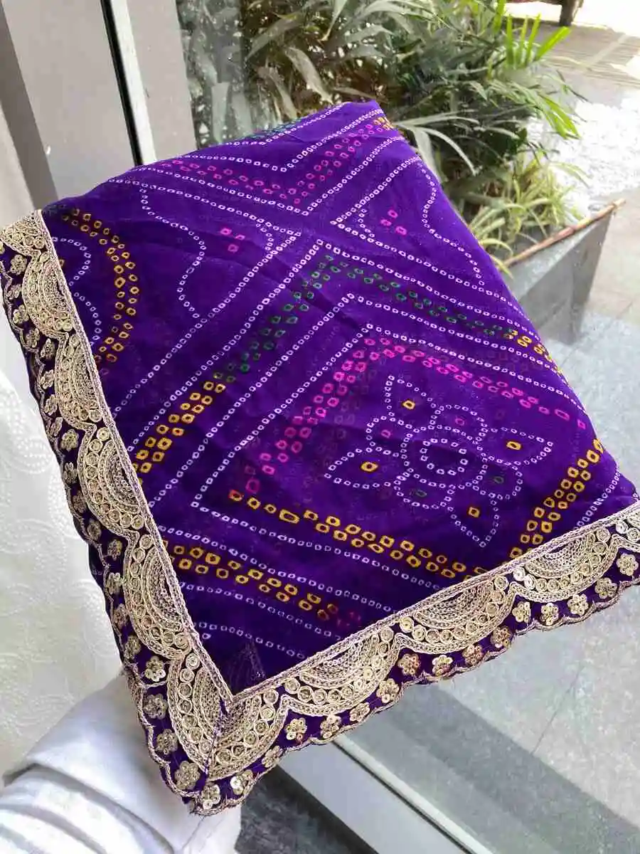 DESIGNER GEORGETTE BANDHEJ PRINT WITH CUTWORK LACE BORDER WORK SAREE WITH UNSTITCHED BLOUSE PURPLE