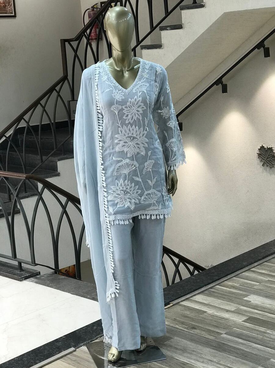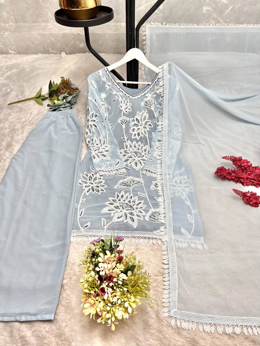DESIGNER GEORGETTE BEAUTIFUL CHAIN STITCH EMBROIDERY SEQUENCE WITH GPO LACE WORK TOP PALAZZO WITH DUPATTA SKY