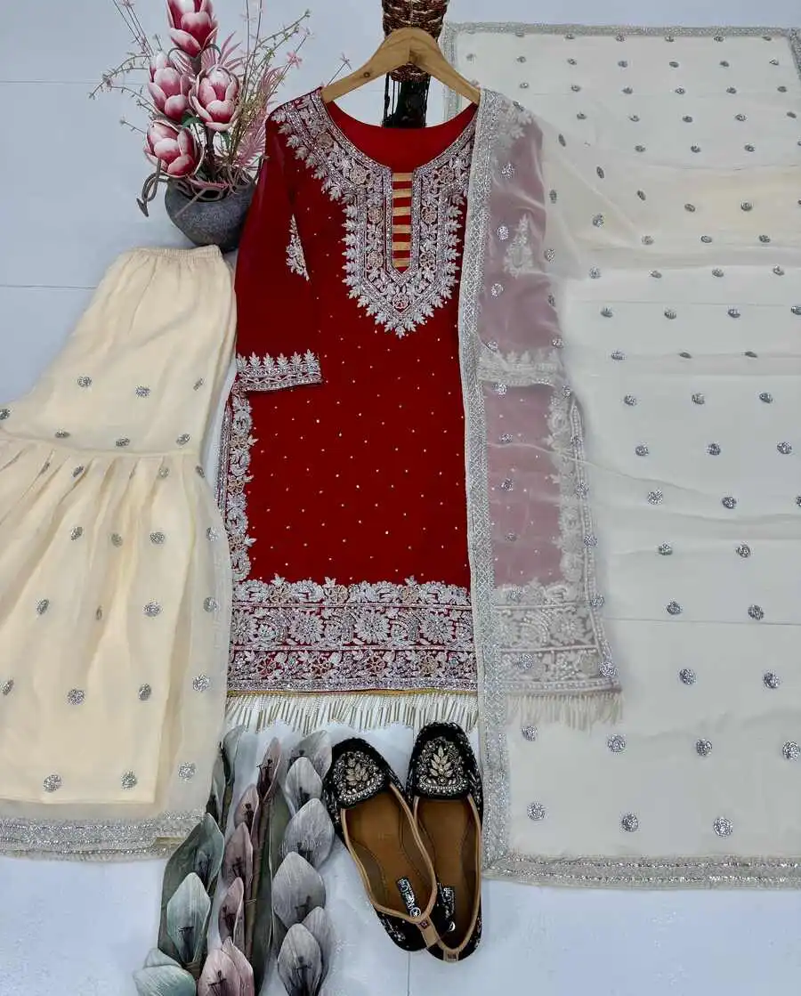 DESIGNER GEORGETTE CHAIN SEQUENCE WORK WITH FANCY LACE AND HAND WORK TOP SHARARA WITH DUPATTA RED