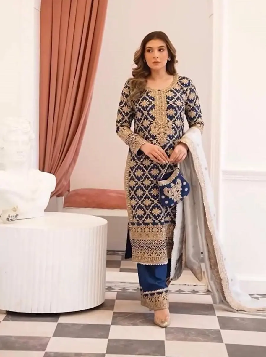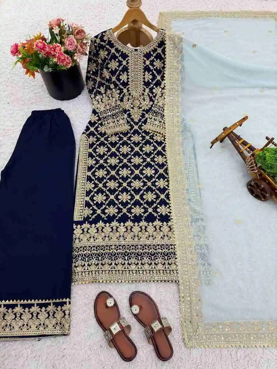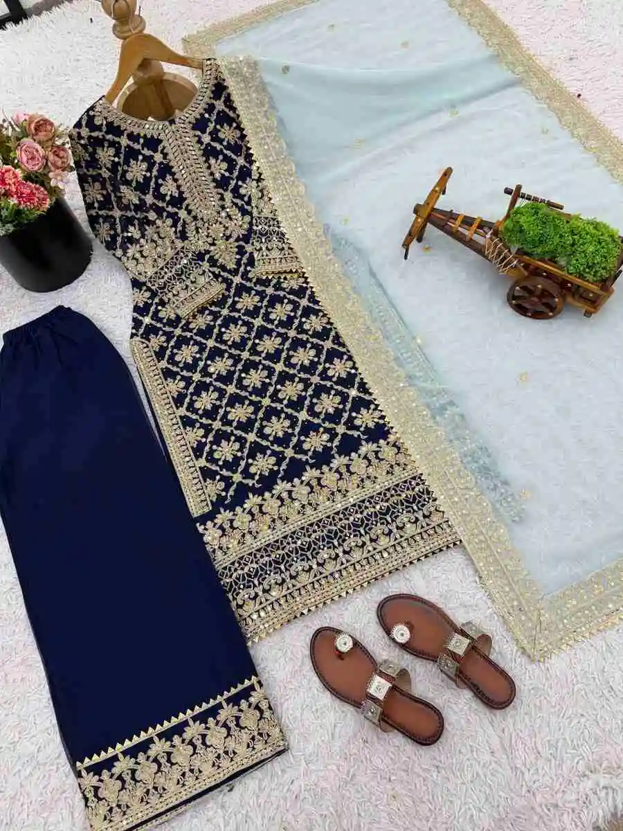 DESIGNER GEORGETTE CHAIN STITCH EMBROIDERY SEQUENCE AND BEADS WORK TOP PALAZZO WITH DUPATTA BLUE
