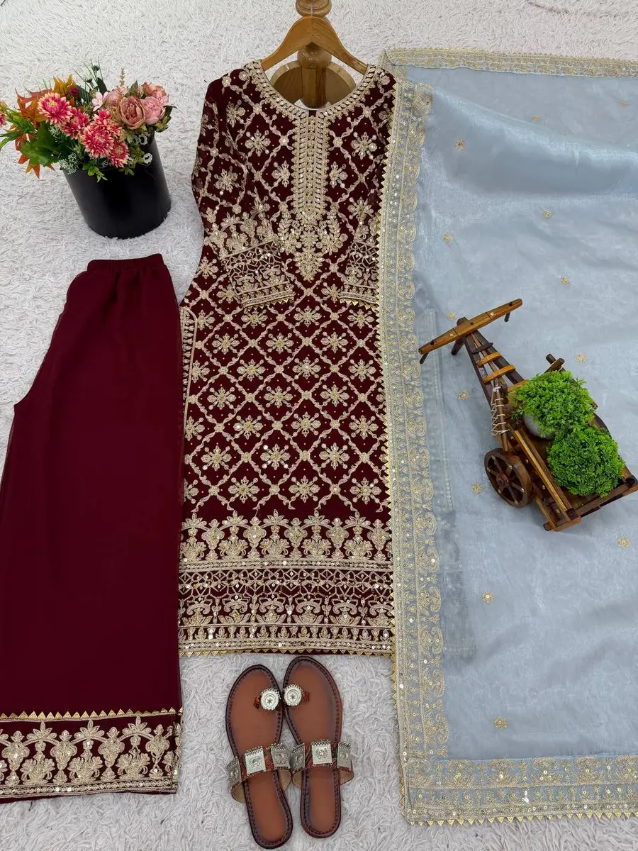DESIGNER GEORGETTE CHAIN STITCH EMBROIDERY SEQUENCE AND BEADS WORK TOP PALAZZO WITH DUPATTA MAROON
