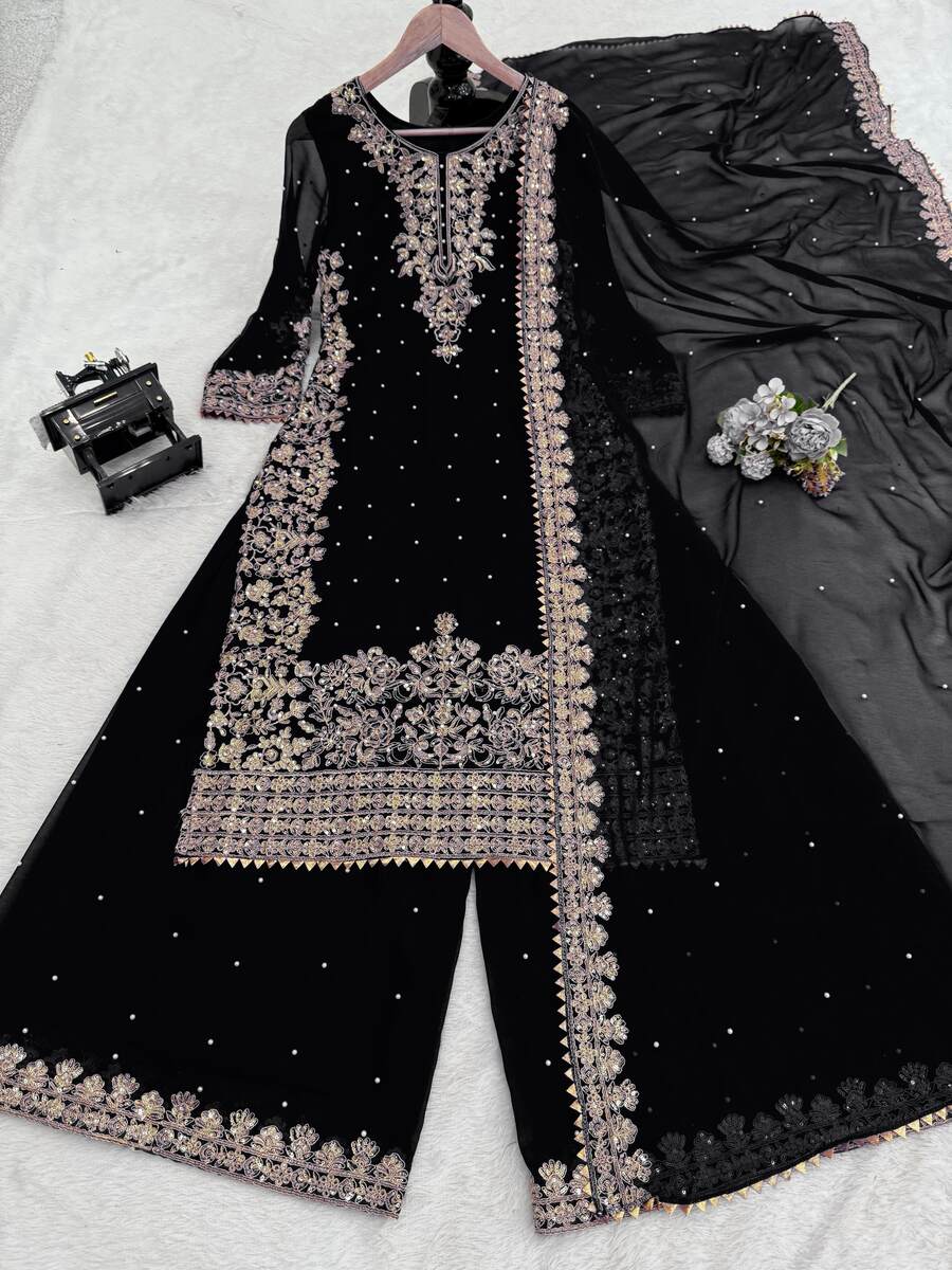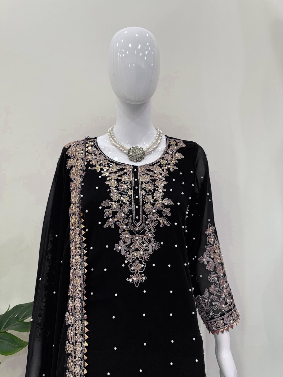 DESIGNER GEORGETTE CODING AND SEQUENCE WITH RIVET MOTI WORK TOP PALAZZO WITH DUPATTA BLACK