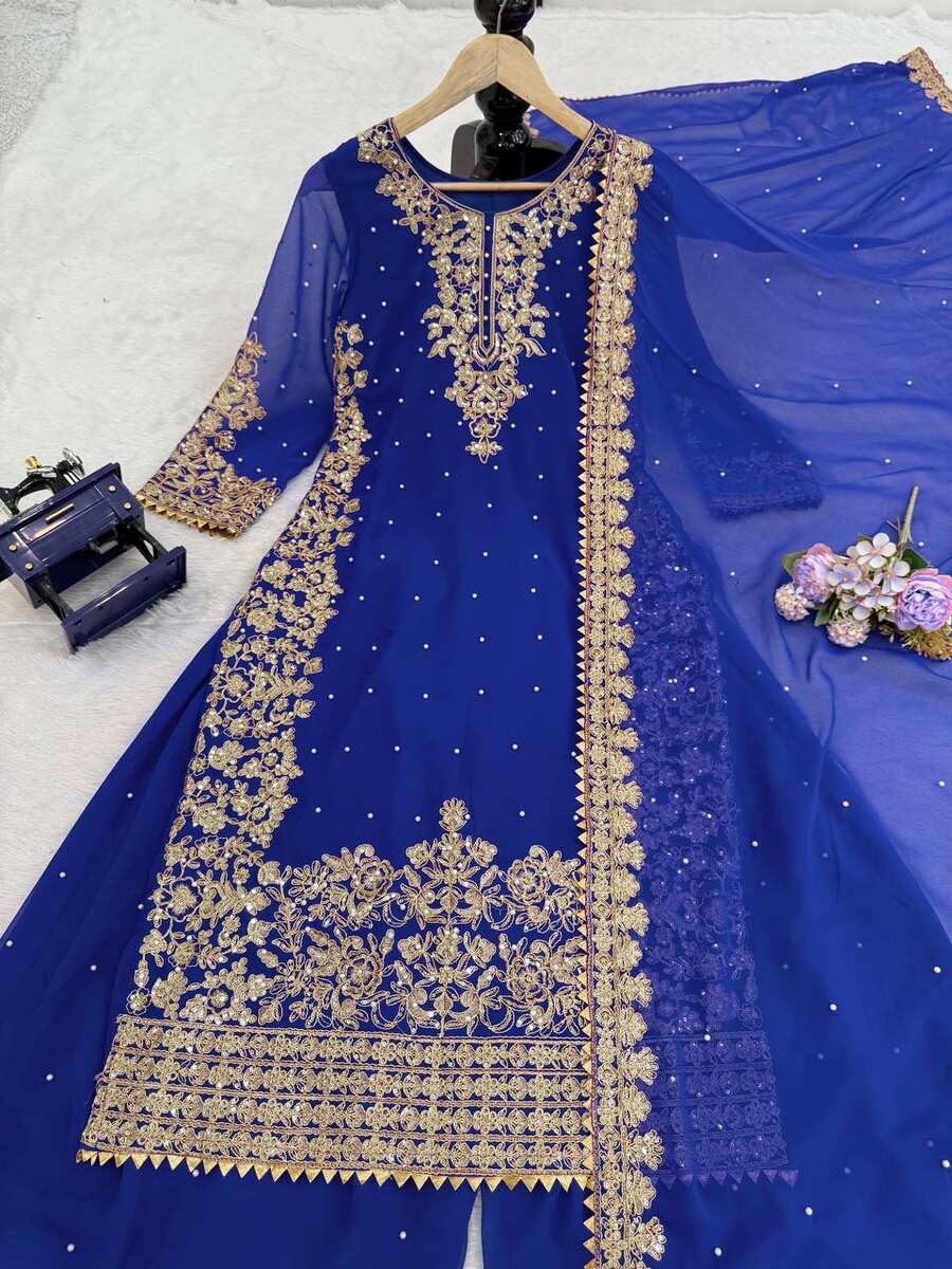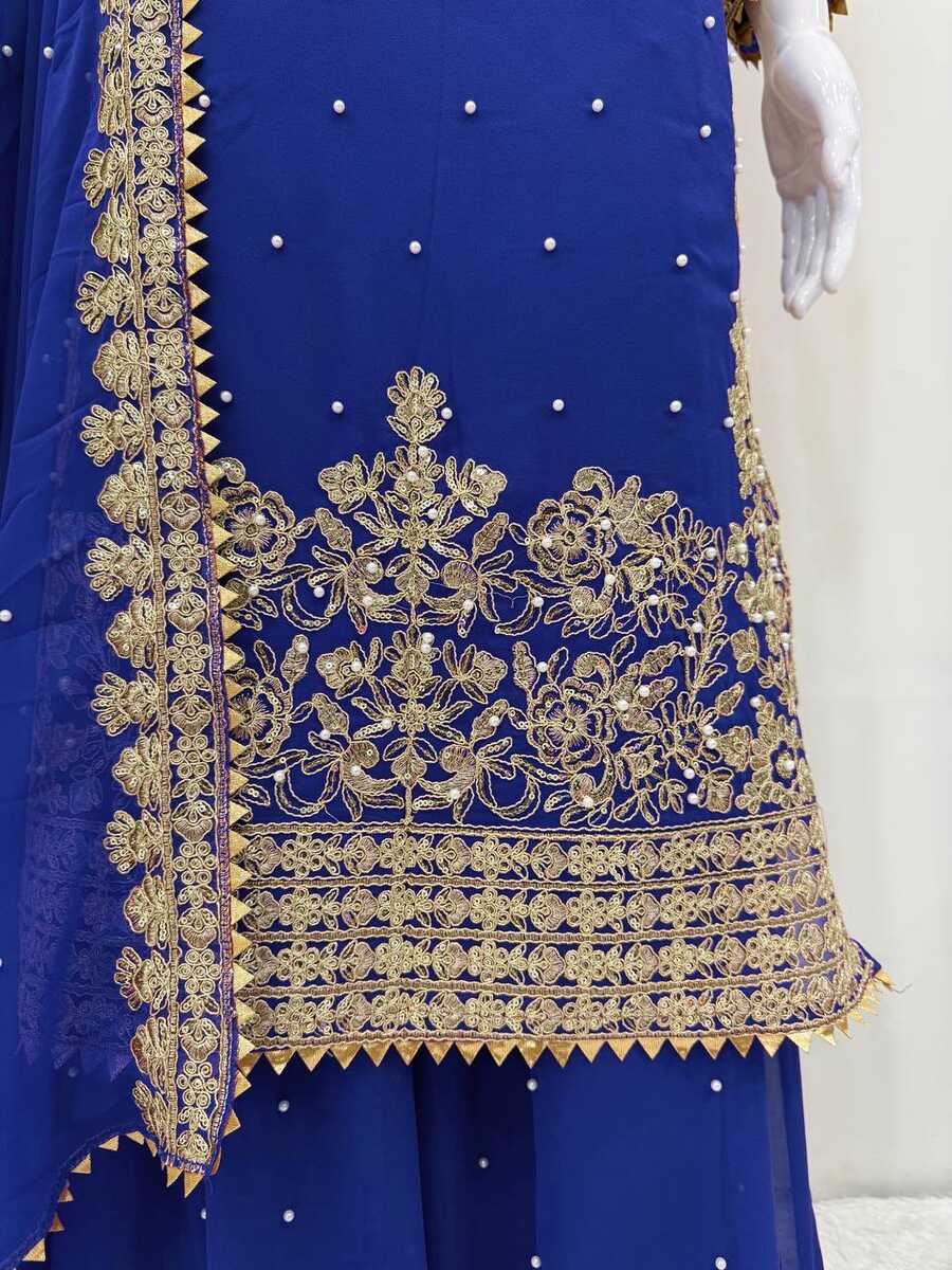 DESIGNER GEORGETTE CODING AND SEQUENCE WITH RIVET MOTI WORK TOP PALAZZO WITH DUPATTA BLUE