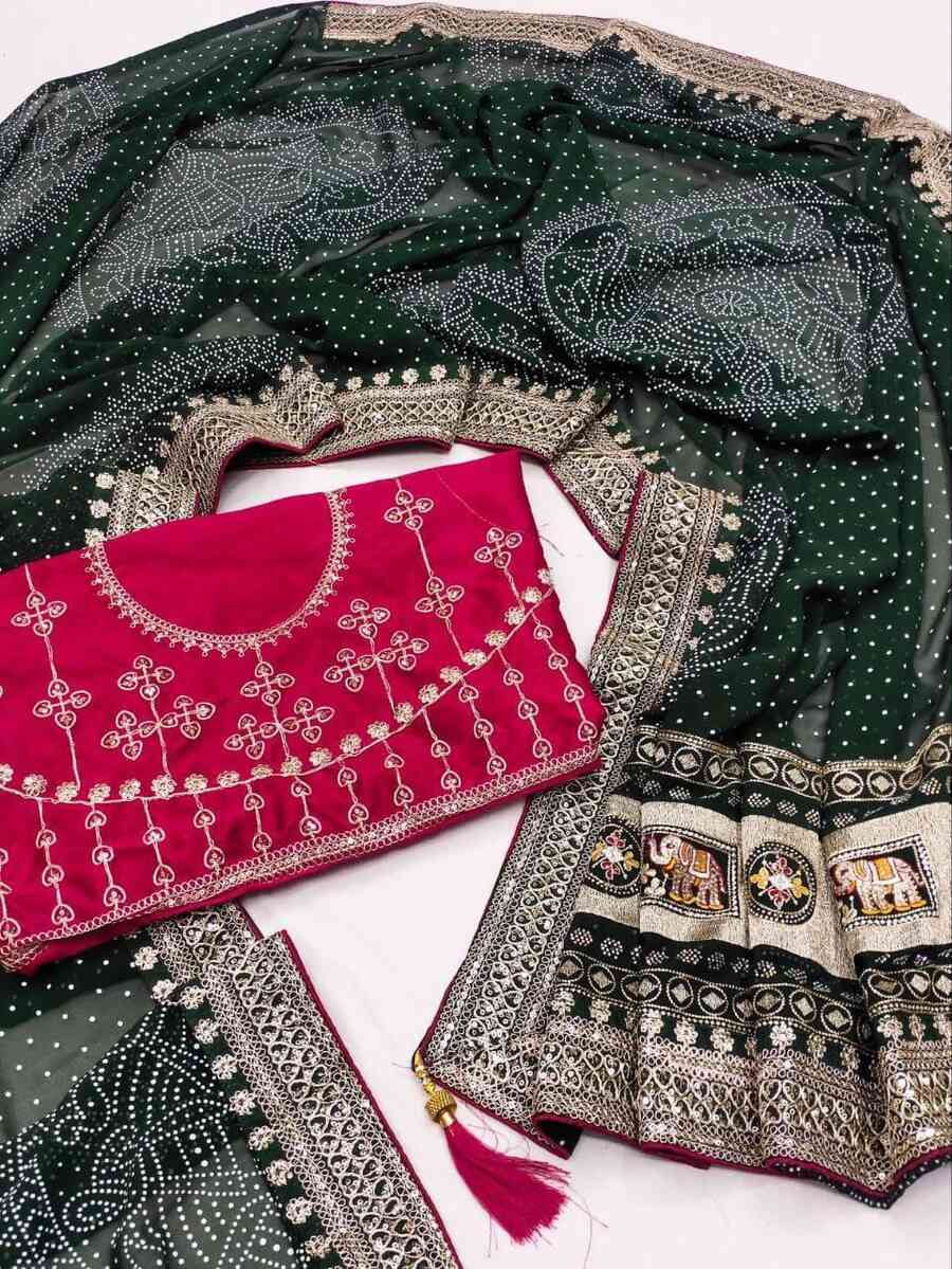 DESIGNER GEORGETTE CODING SEQUENCE BORDER WITH BADHANI FOIL PRINT WORK SAREE WITH UNSITCHED BLOUSE GREEN