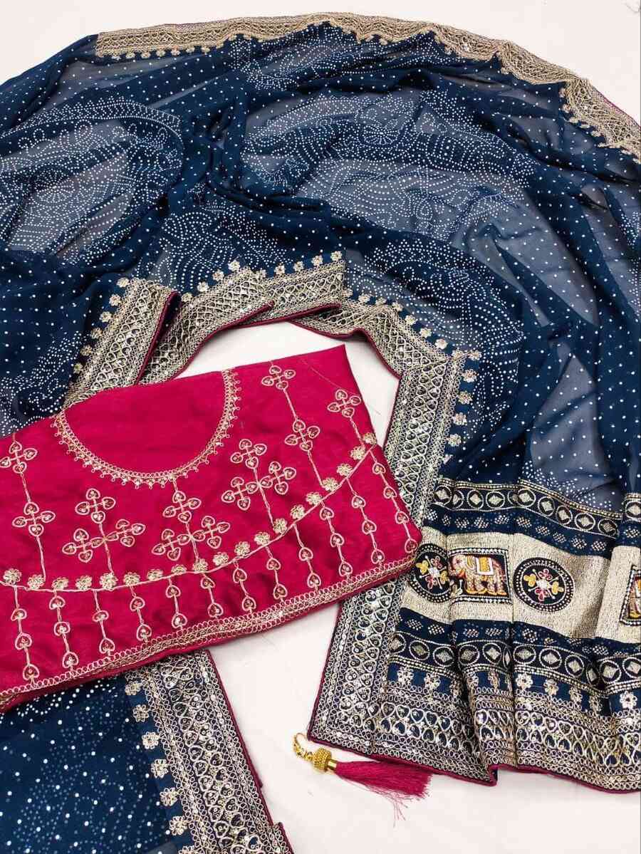DESIGNER GEORGETTE CODING SEQUENCE BORDER WITH BADHANI FOIL PRINT WORK SAREE WITH UNSITCHED BLOUSE NAVY BLUE
