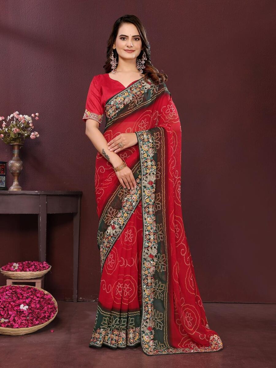 DESIGNER GEORGETTE DIGITAL PRINT WITH CONTRAST PALLU EMBROIDERY WORK SAREE WITH UNSTITCHED BLOUSE RED