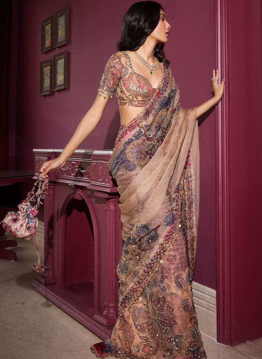 DESIGNER GEORGETTE DIGITAL PRINT WITH HAND MIRROR, ZARI & SEQUENCE WORK SAREE WITH UNSTITCHED BLOUSE PEACH