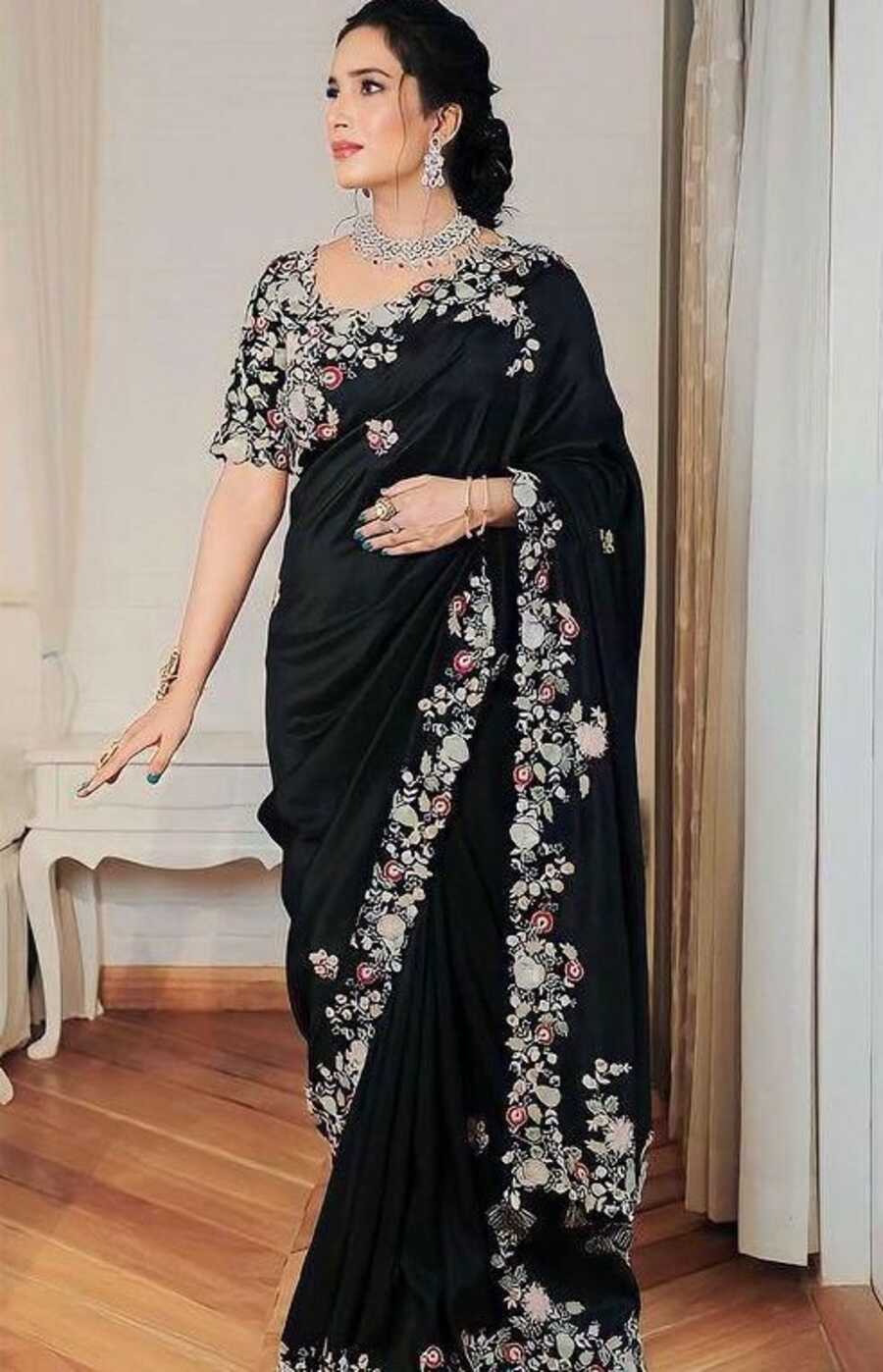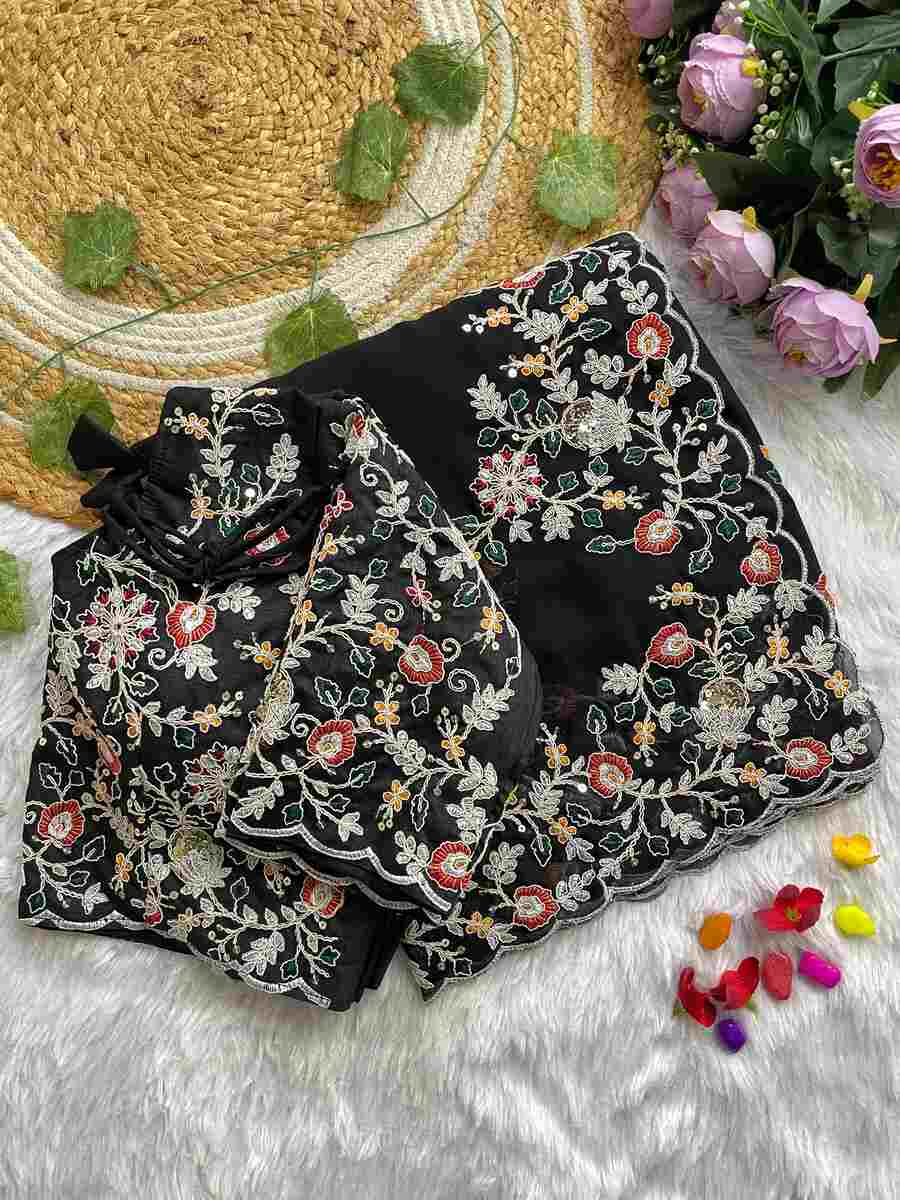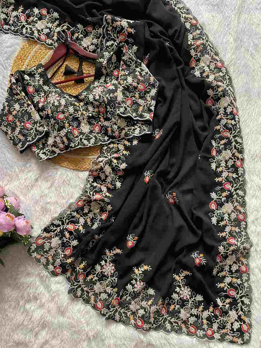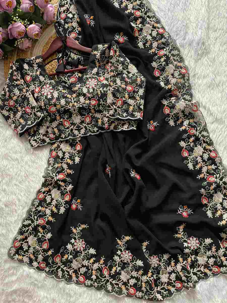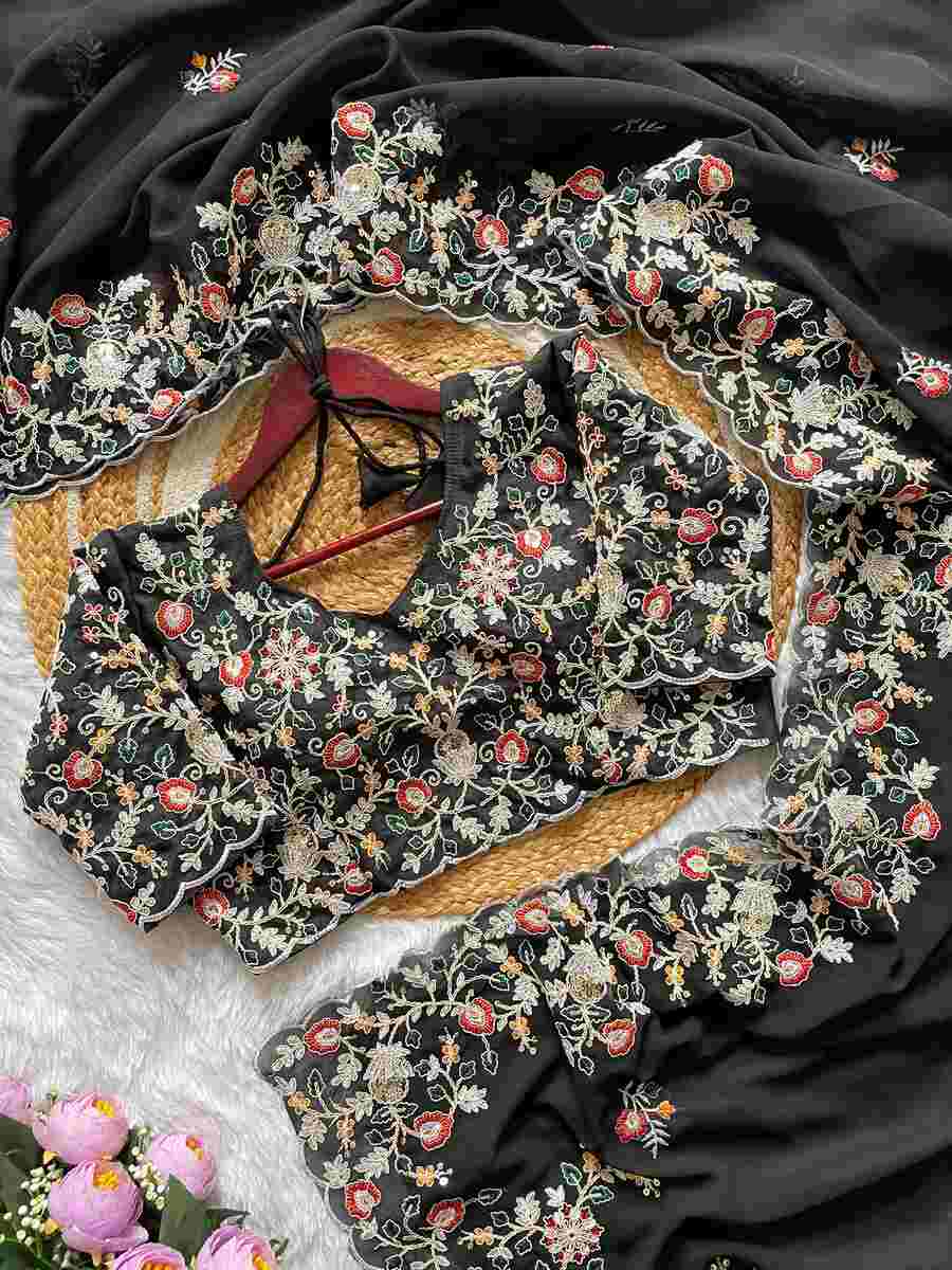 DESIGNER GEORGETTE EMBRODIERY MULTI THREAD, CODING AND SEQUENCE WORK WITH CUT WORK BORDER SAREE WITH UNSTITCHED BLOUSE BLACK