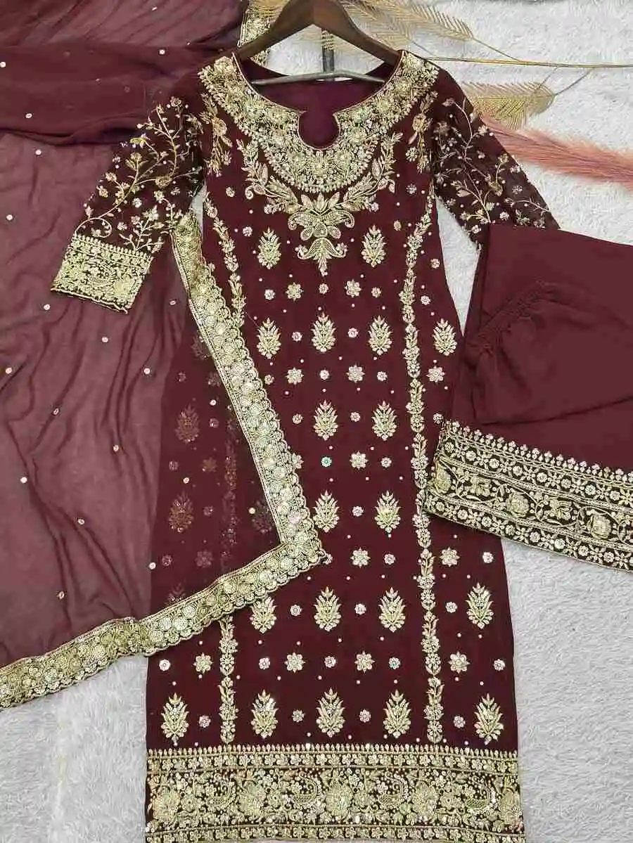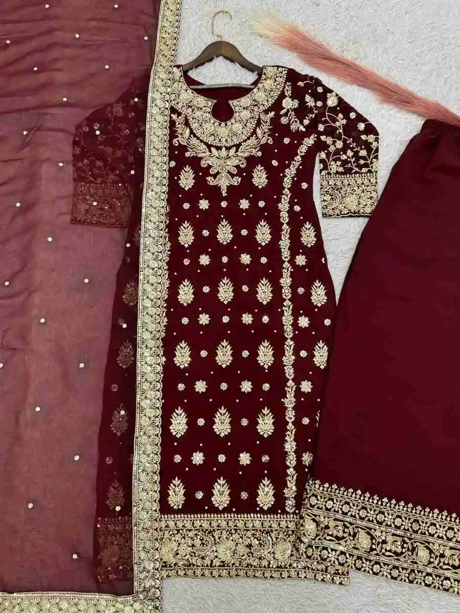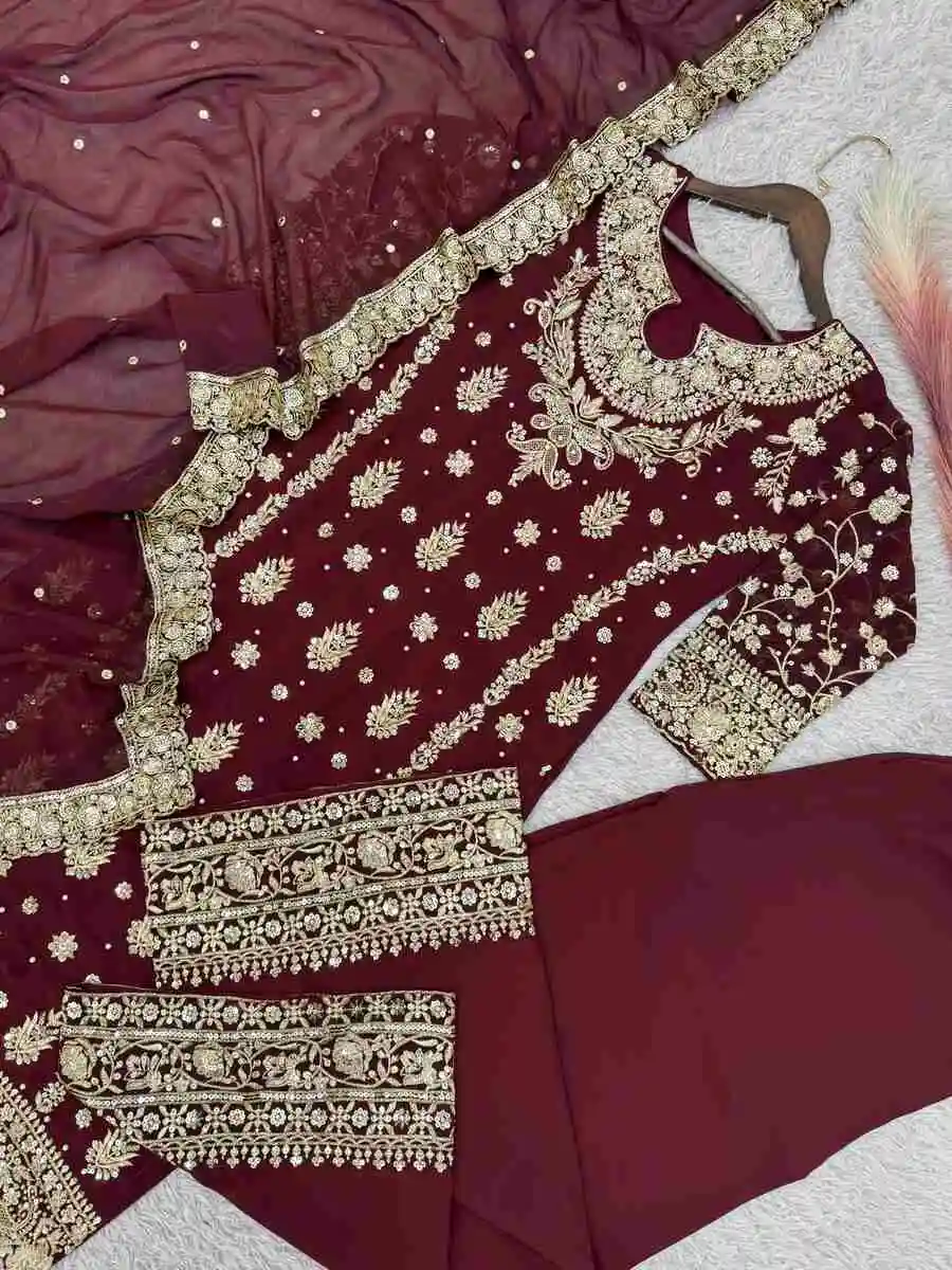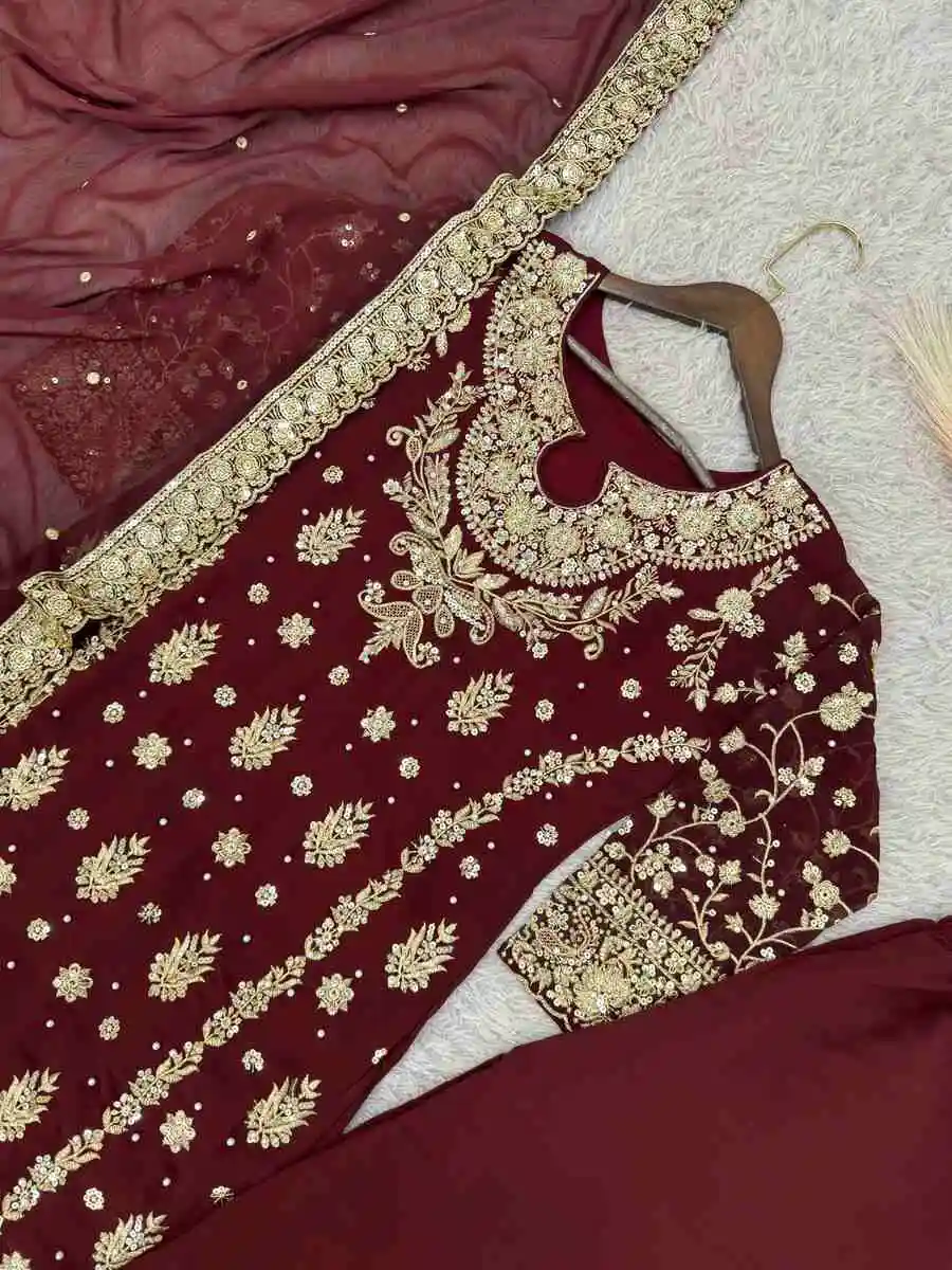 DESIGNER GEORGETTE EMBROIDERY AND SEQUENCE WORK AND RIVETED MOTI WORK TOP PALAZZO WITH DUPATTA MAROON