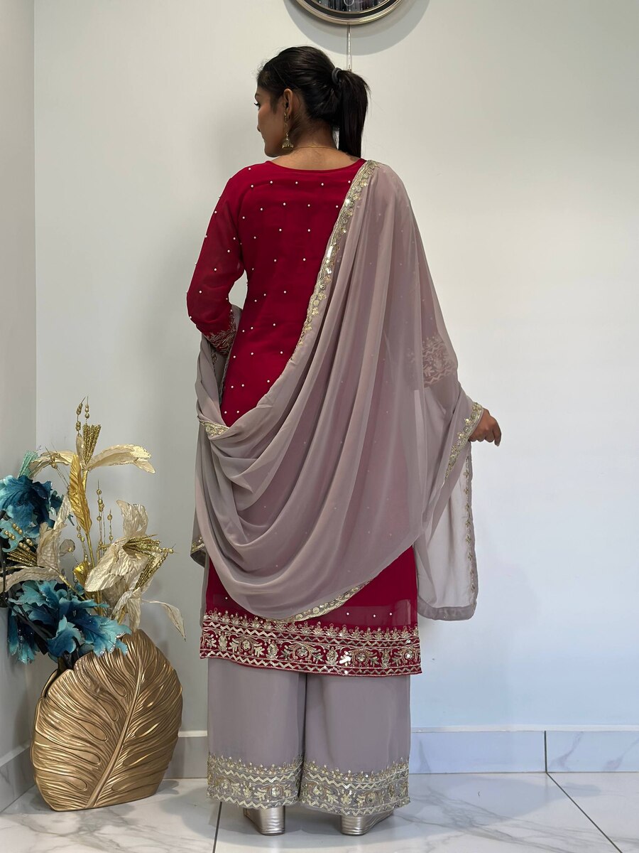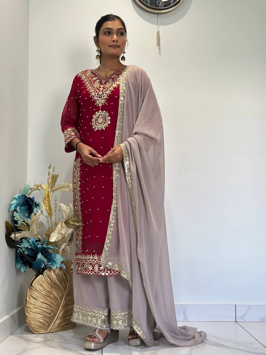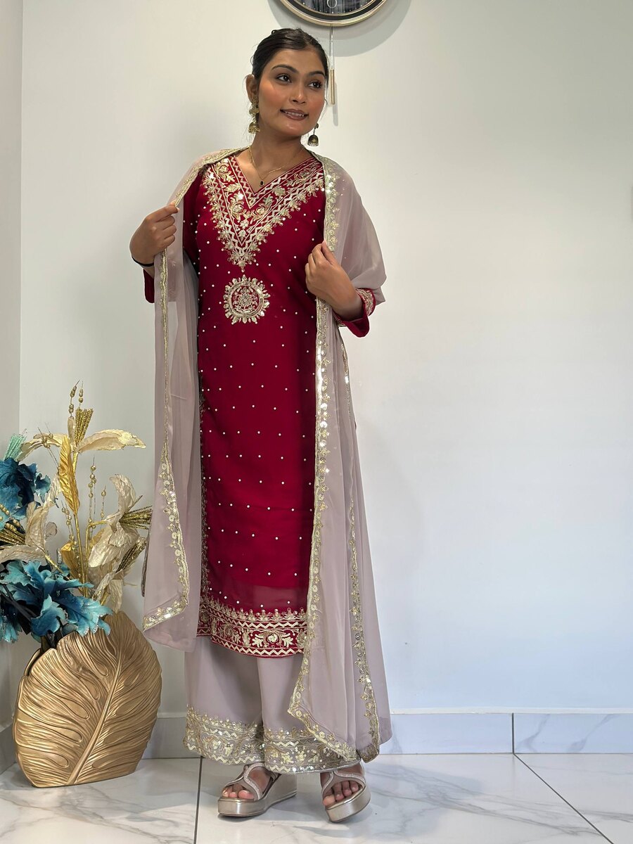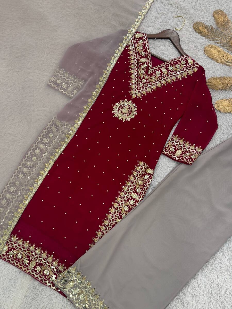 DESIGNER GEORGETTE EMBROIDERY AND SEQUENCE WORK AND RIVETED MOTI WORK TOP PALAZZO WITH DUPATTA MAROON