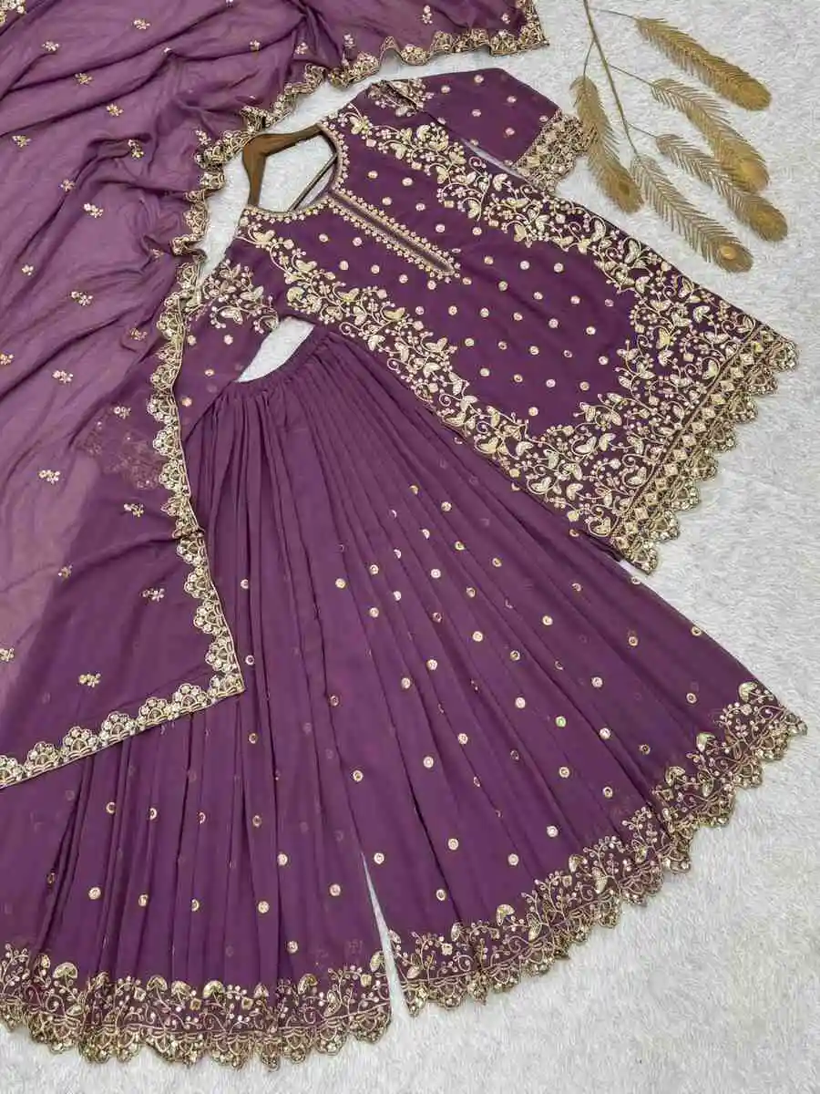 DESIGNER GEORGETTE EMBROIDERY AND SEQUENCE WORK WITH CUT WORK TOP PALAZZO WITH DUPATTA PURPLE