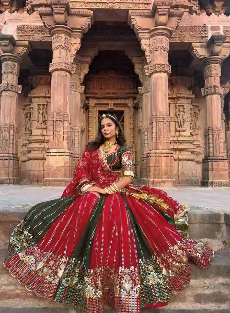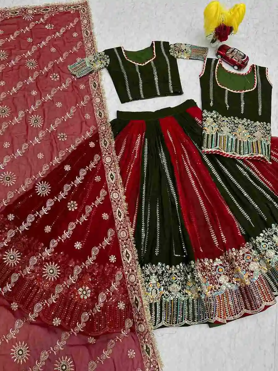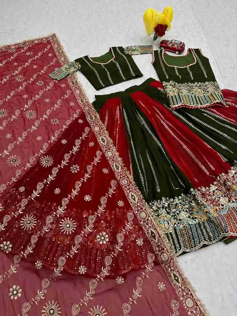DESIGNER GEORGETTE EMBROIDERY CODING SEQUENCE WORKLEHENGA AND TOP,BLOUSE WITH DUPATTA RED AND GREEN