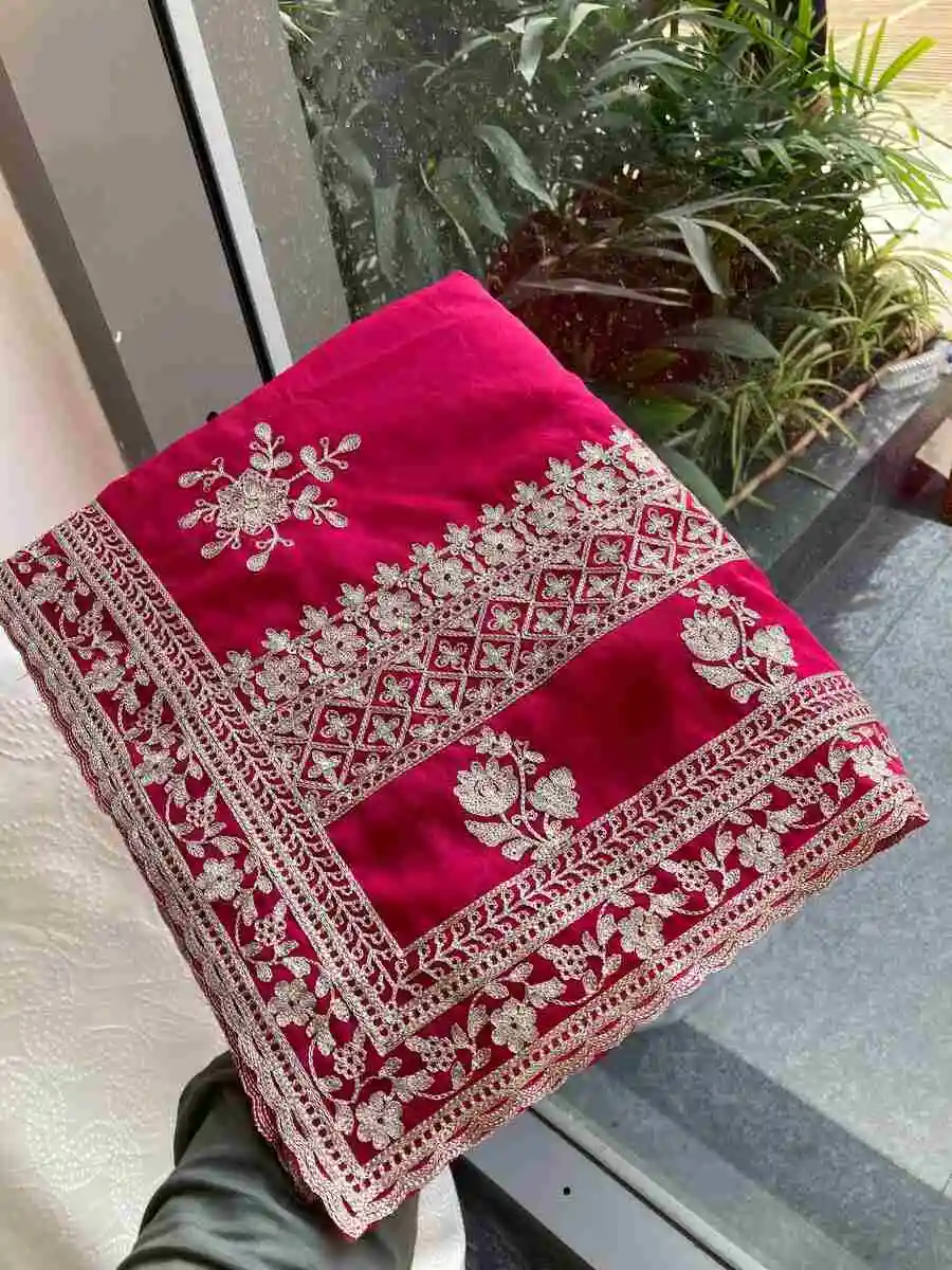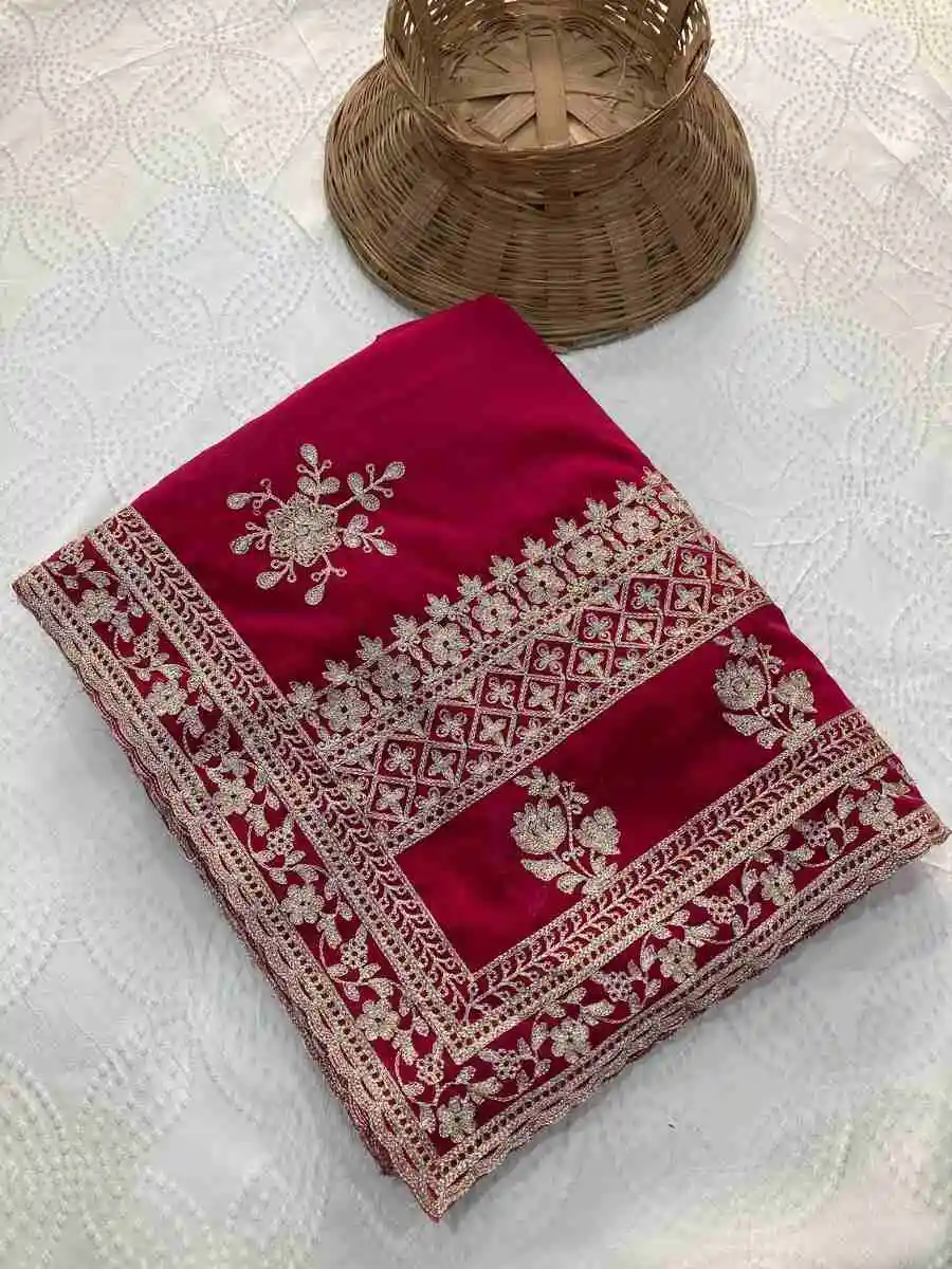 SAREE FABRIC : PURE SOFT JIMMY CHOO WITH HEAVY EMBROIDERY MULTI TREADS , CODING & SEQUENCE WORK & FANCY CUT WORK BORDER