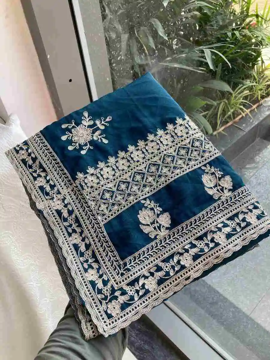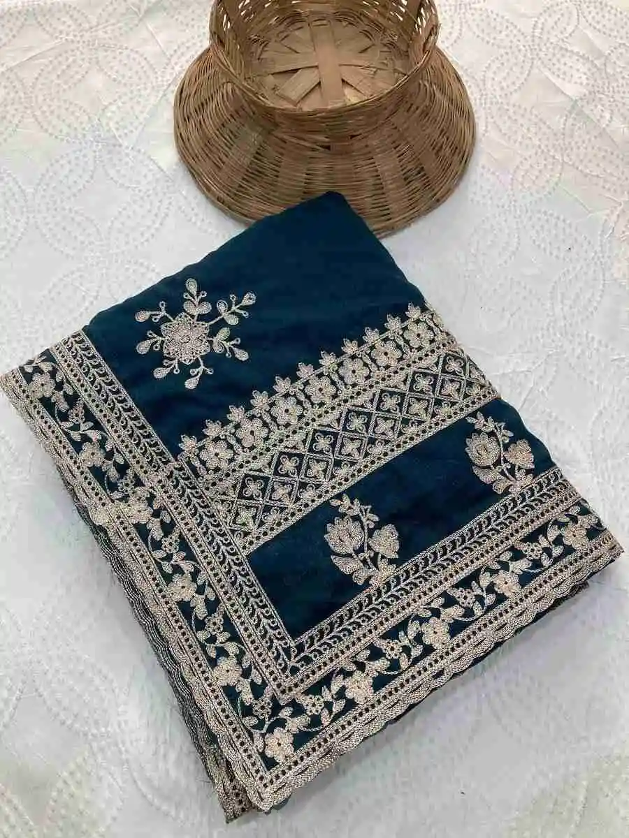 DESIGNER GEORGETTE EMBROIDERY CUTWORK WORK ARC BORDER WORK SAREE WITH UNSTITCHED BLOUSE TEAL