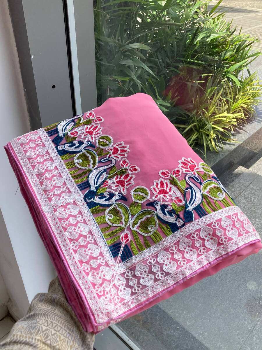 SAREE FABRIC : PREMIUM GEORGETTE WITH EMBROIDERY CODING WITH SEQUENCE WORK WITH PIPING BORDER