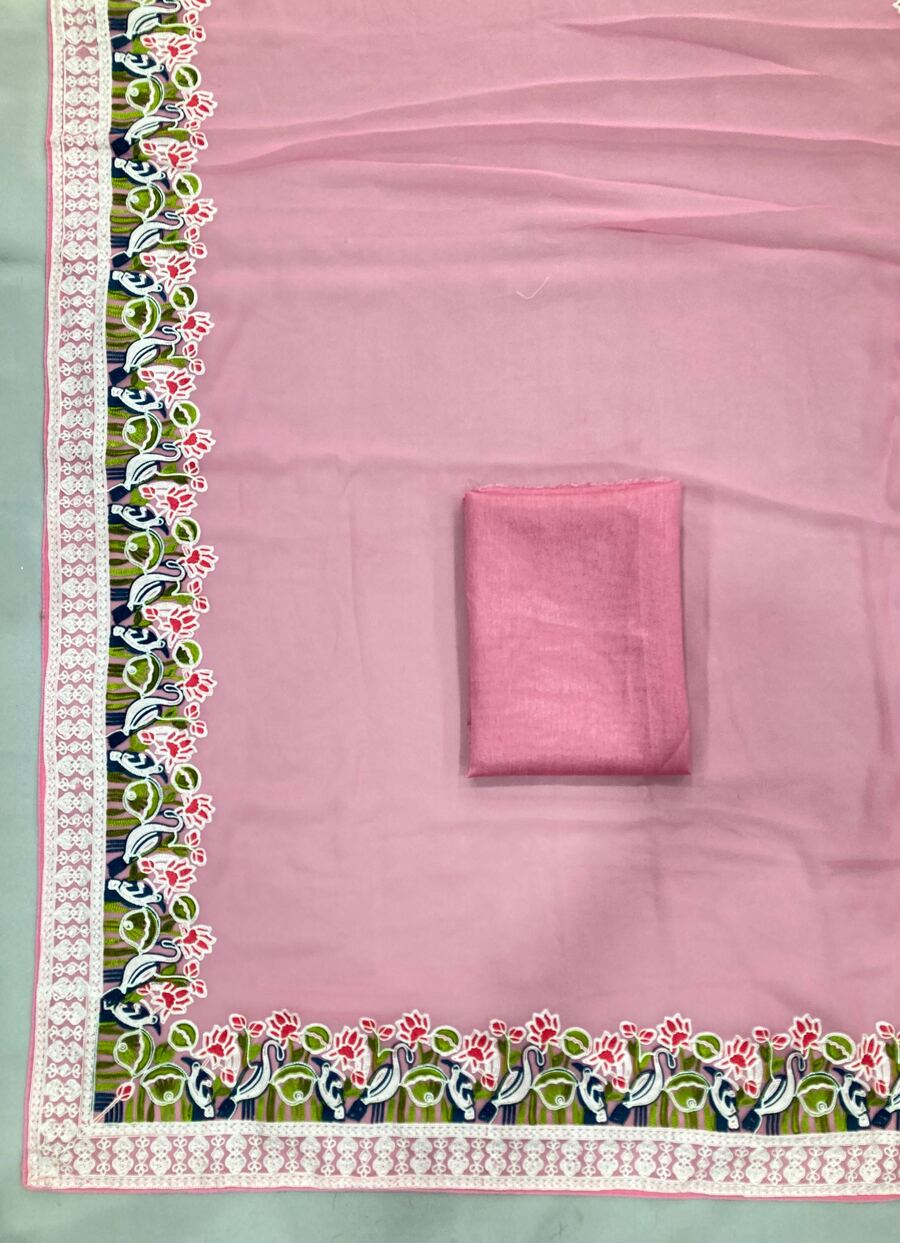 DESIGNER GEORGETTE EMBROIDERY CUTWORK WORK LACE BORDER WORK SAREE WITH UNSTITCHED BLOUSE BABY PINK