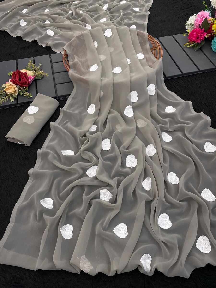 DESIGNER GEORGETTE EMBROIDERY HEART WORK SAREE WITH UNSTITCHED BLOUSE GREY