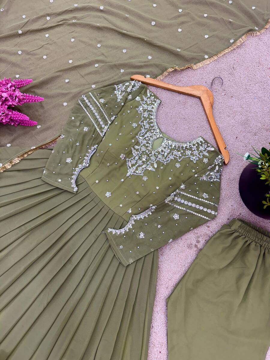 GOWN FABRIC : HEAVY FAUX GEORGETTE WITH HEAVY 5MM SEQUENCE EMBROIDERY WORK WITH SLEEVE WITH (ATTACHED PAID)